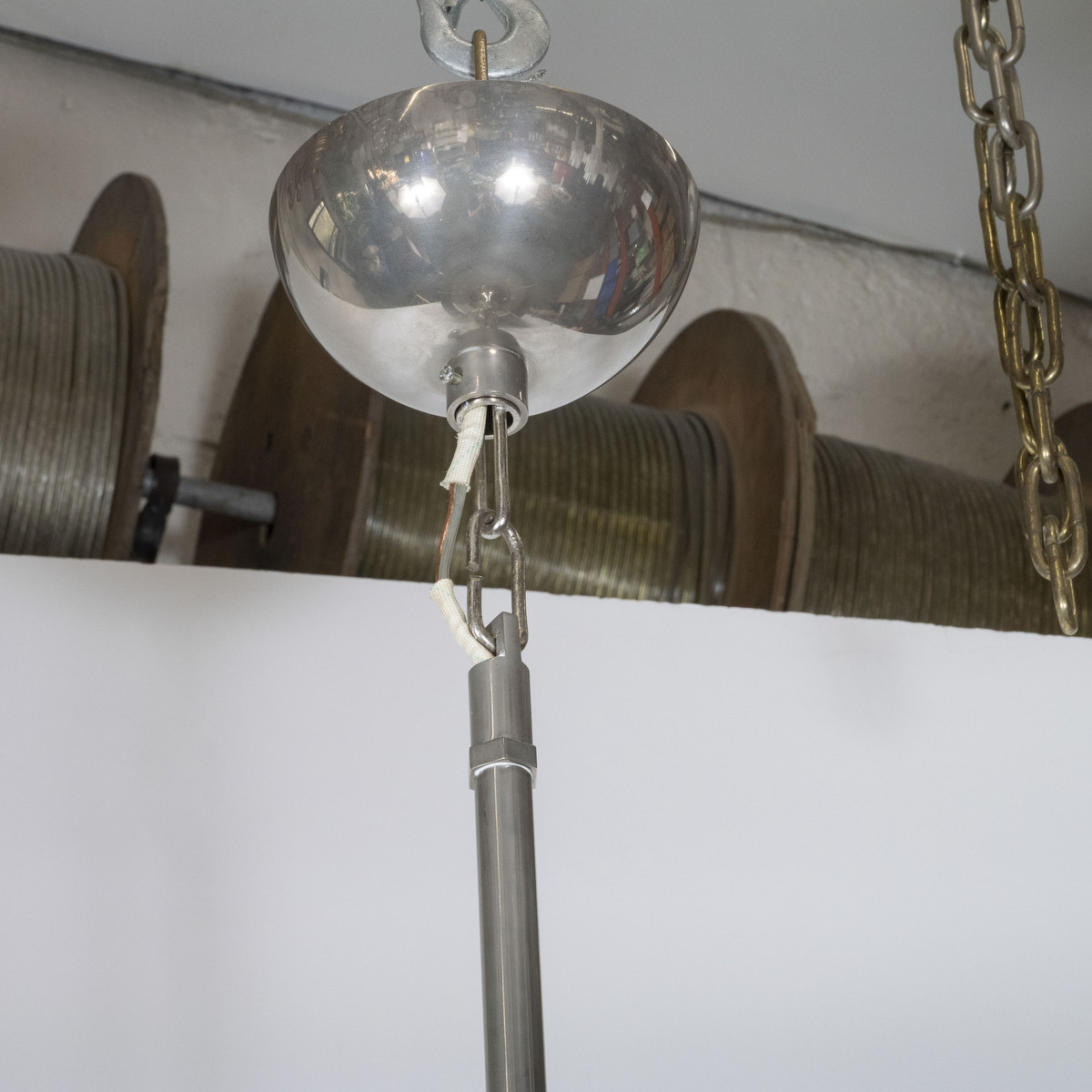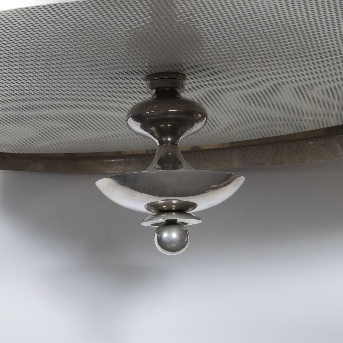 Large scale drum chandelier with mesh diffuser and spun details.