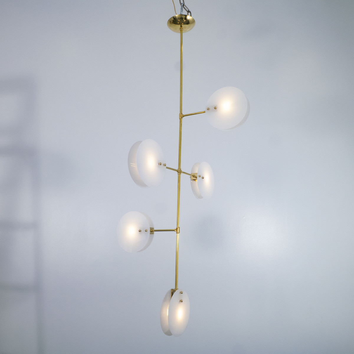 Modern brass chandelier with thin circular opaline glass shades