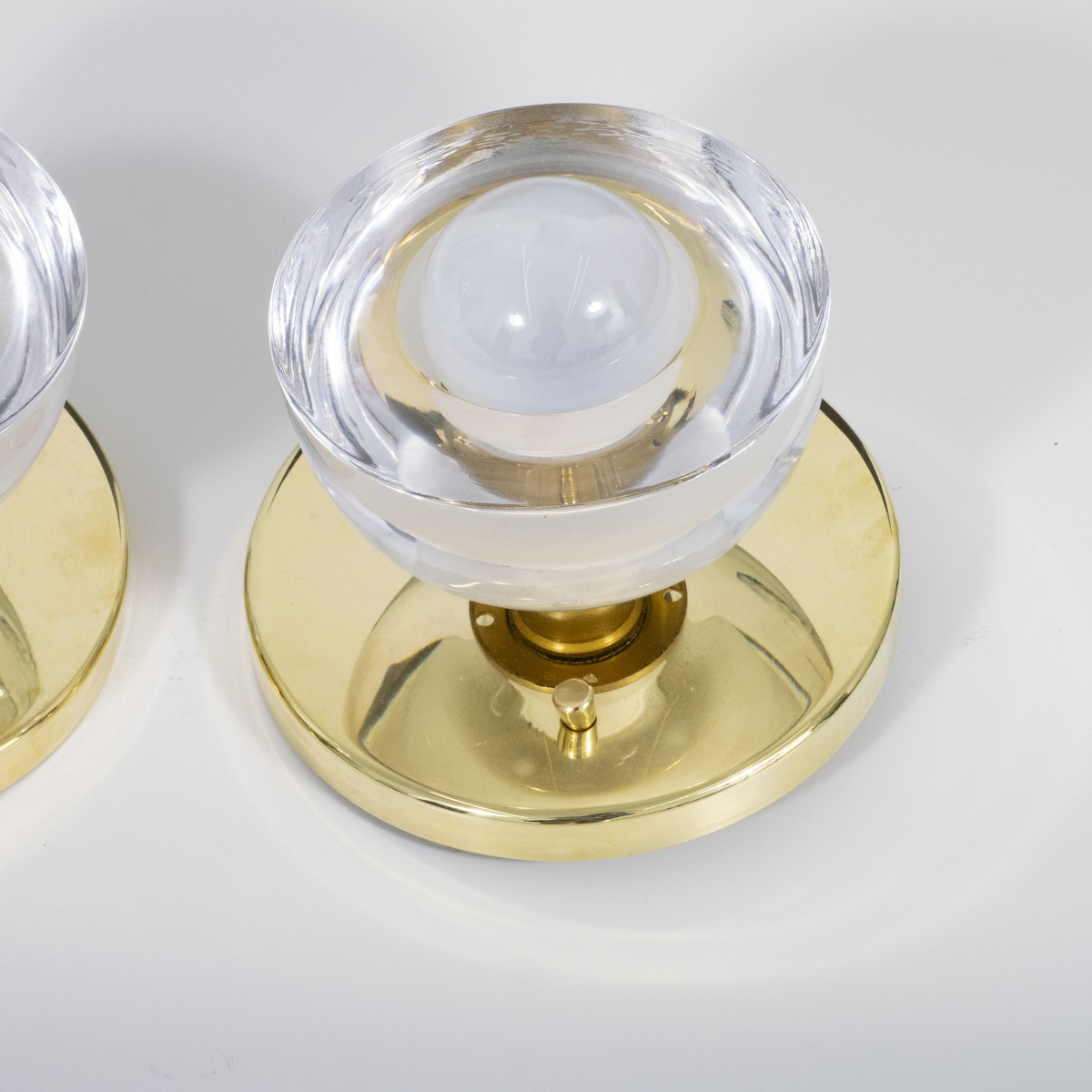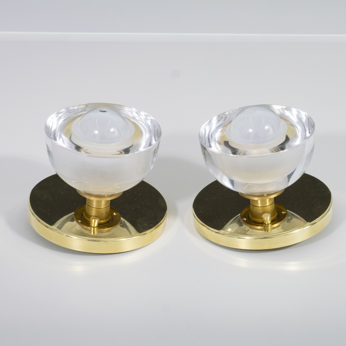 Pair of sconces with Murano glass cup shades and brass hardware. Light bulbs not included.