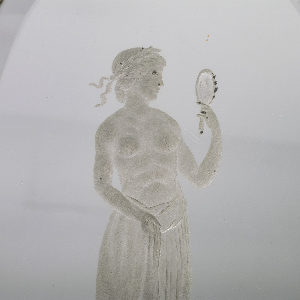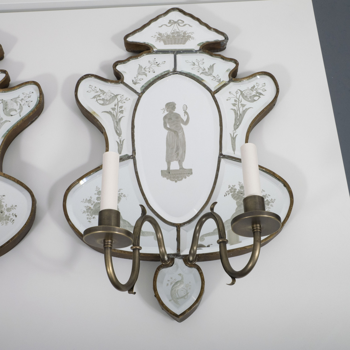 Pair of 19th century Venetian etch mirror wall sconces depicting classical forms and a floral motif.