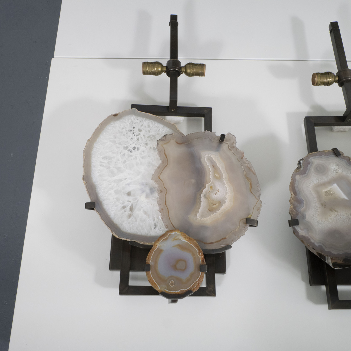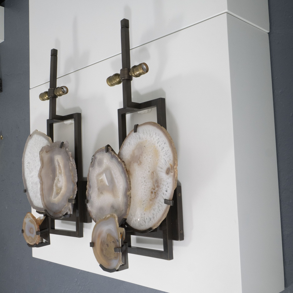 Pair of large geometric frame sconces with antique bronze finish and overlapping cut agate slabs. Shades measure 17" w x 8.5" d x 11" h. x2 E26 sockets and x3 E12 sockets.