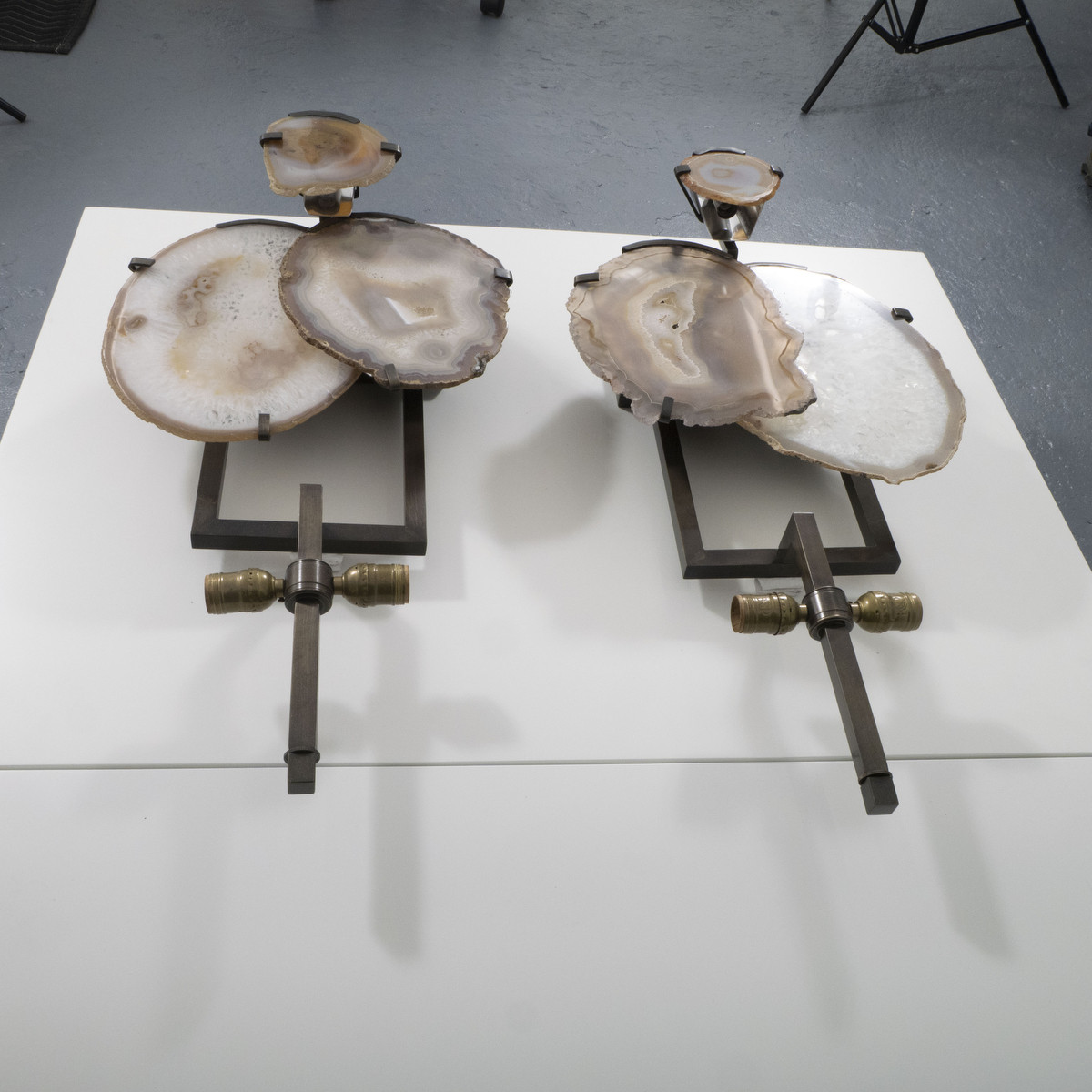 Pair of cut agate wall sconces with fabric shades