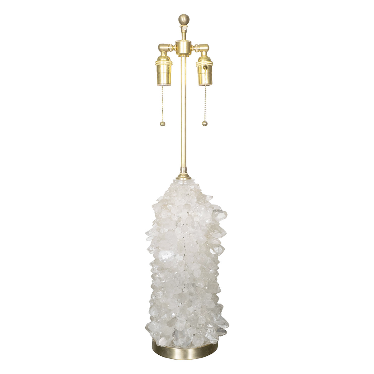 Handcrafted rock crystal quartz lamps composed of stacked pentagonal elements.