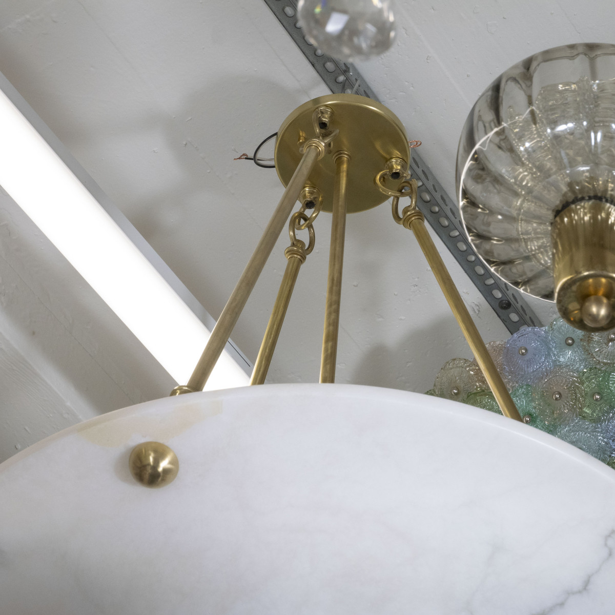Alabaster dome pendant with brass hardware.