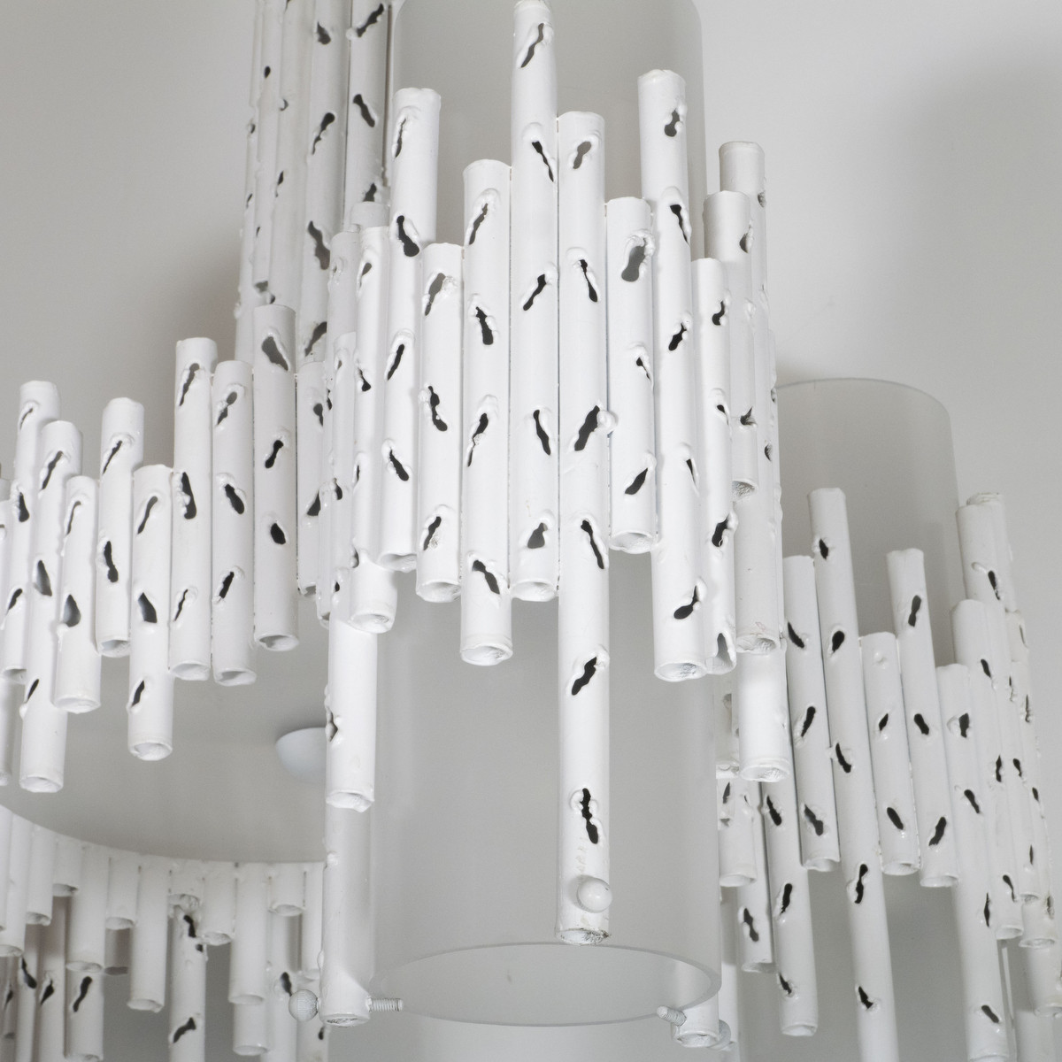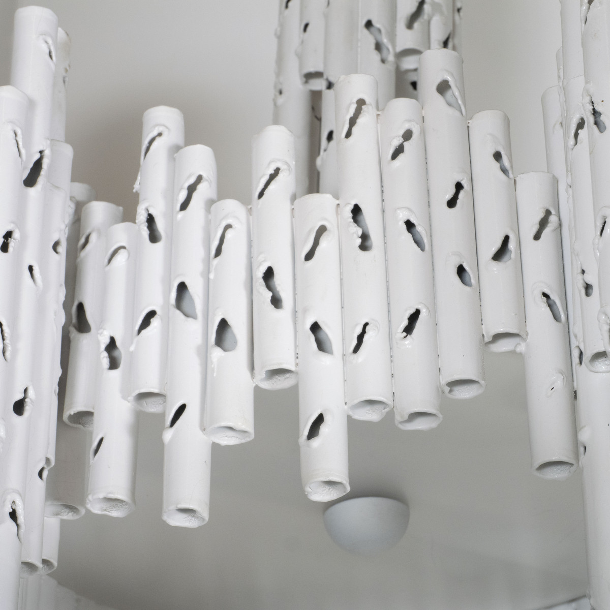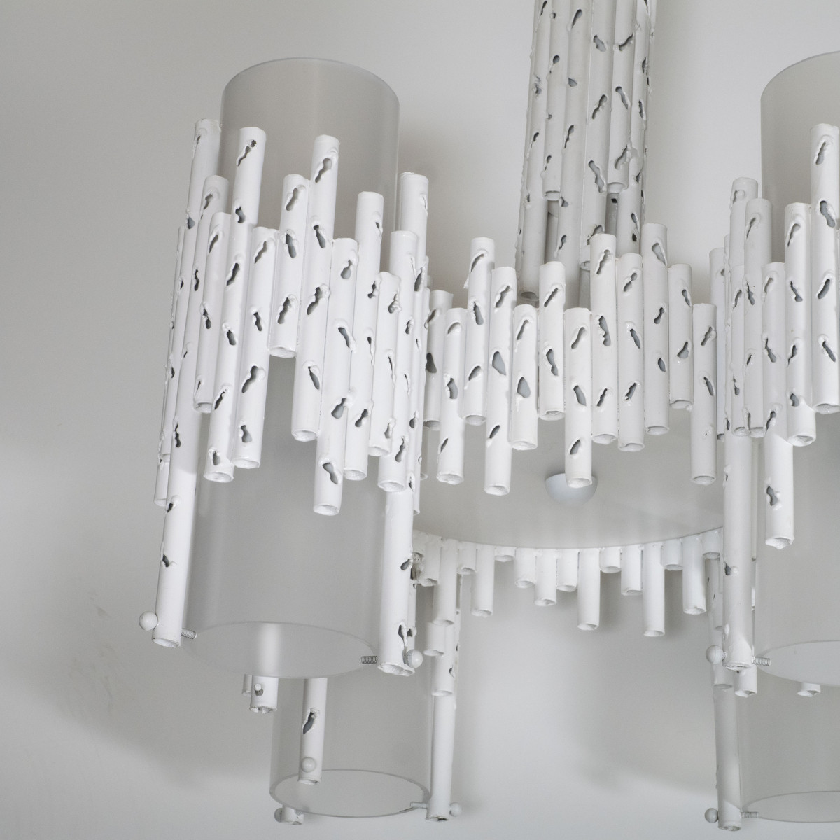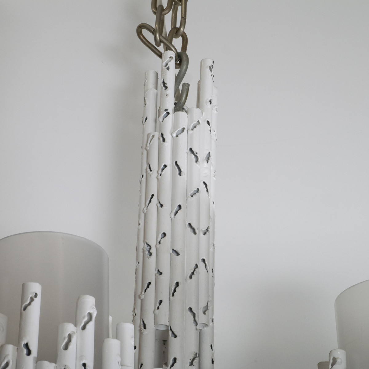 White painted brutalist style torch cut chandelier attributed to Marcello Fantoni. UL certified.