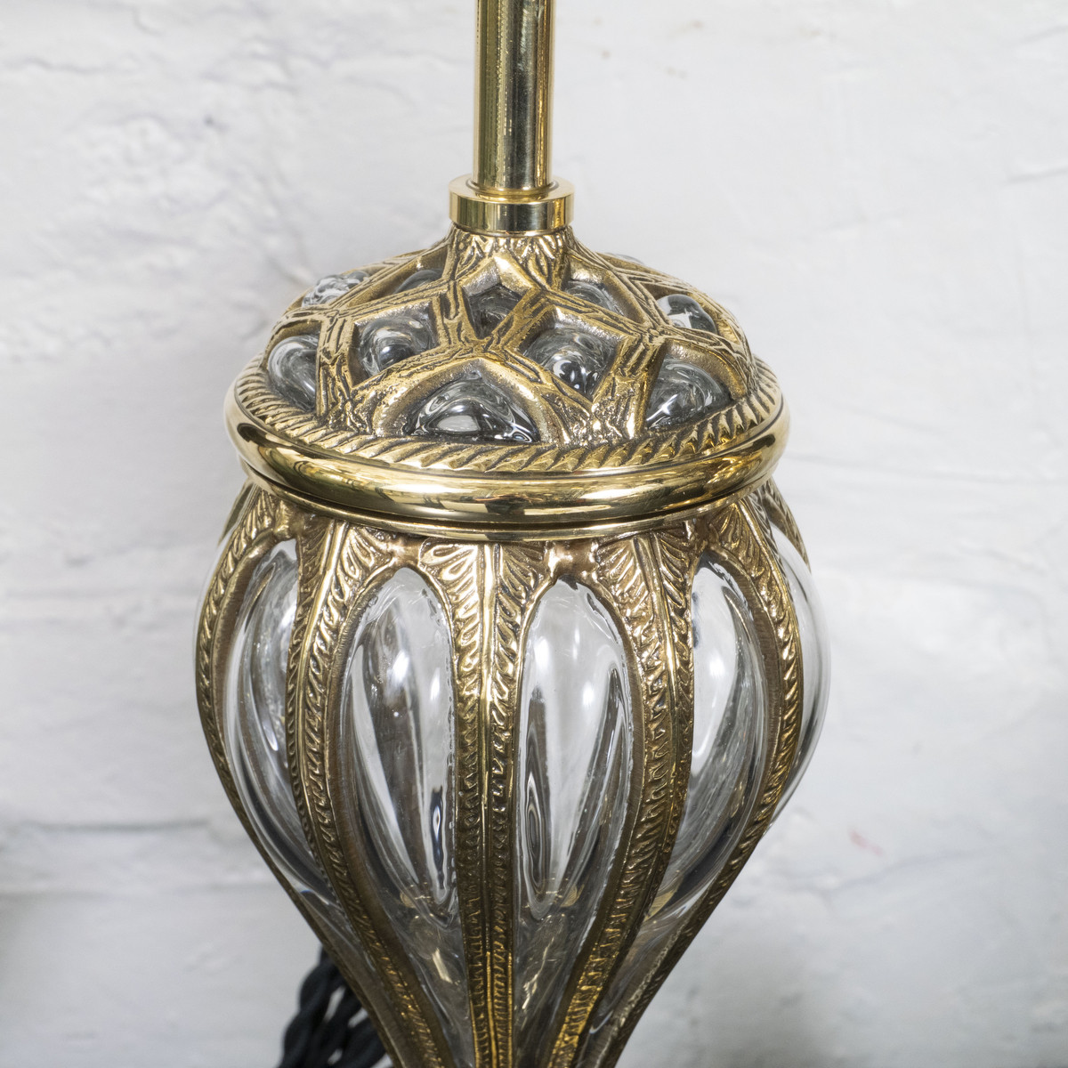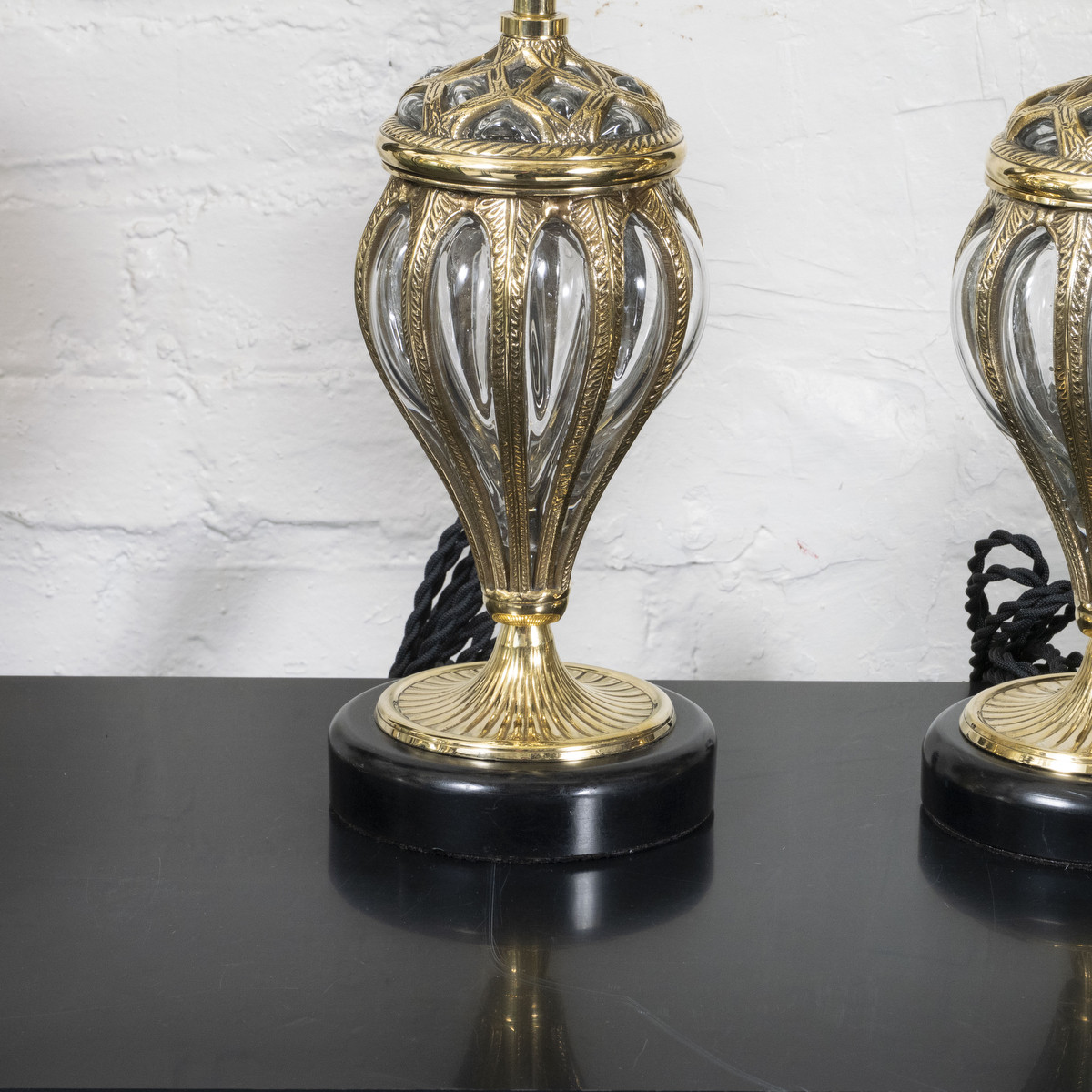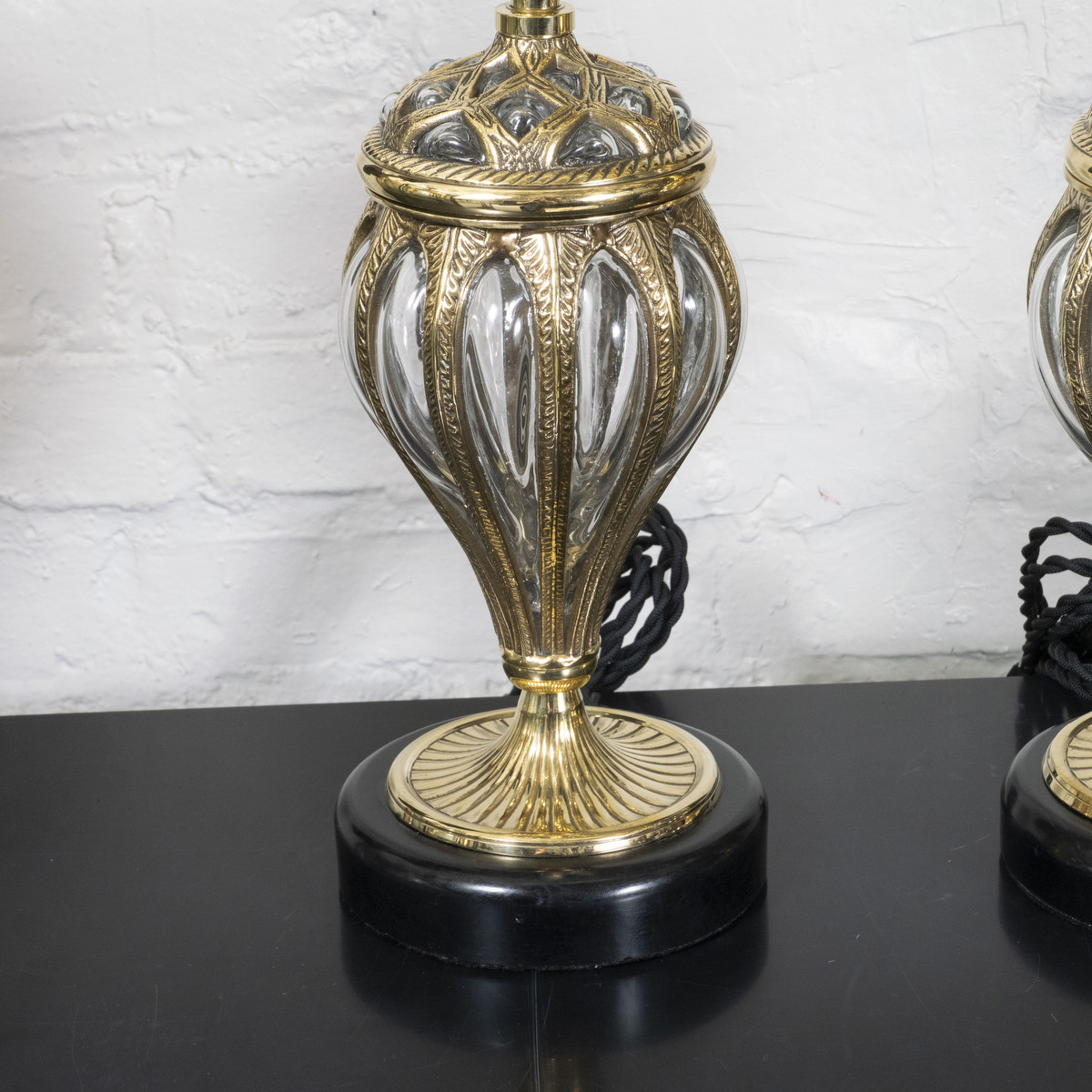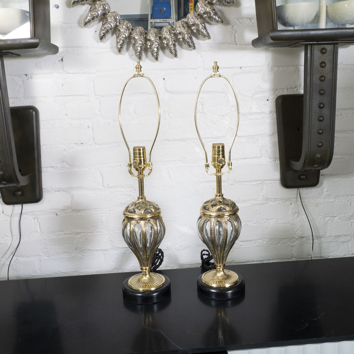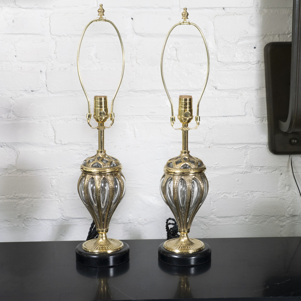 Pair of blown glass table lamps in cast brass cage.