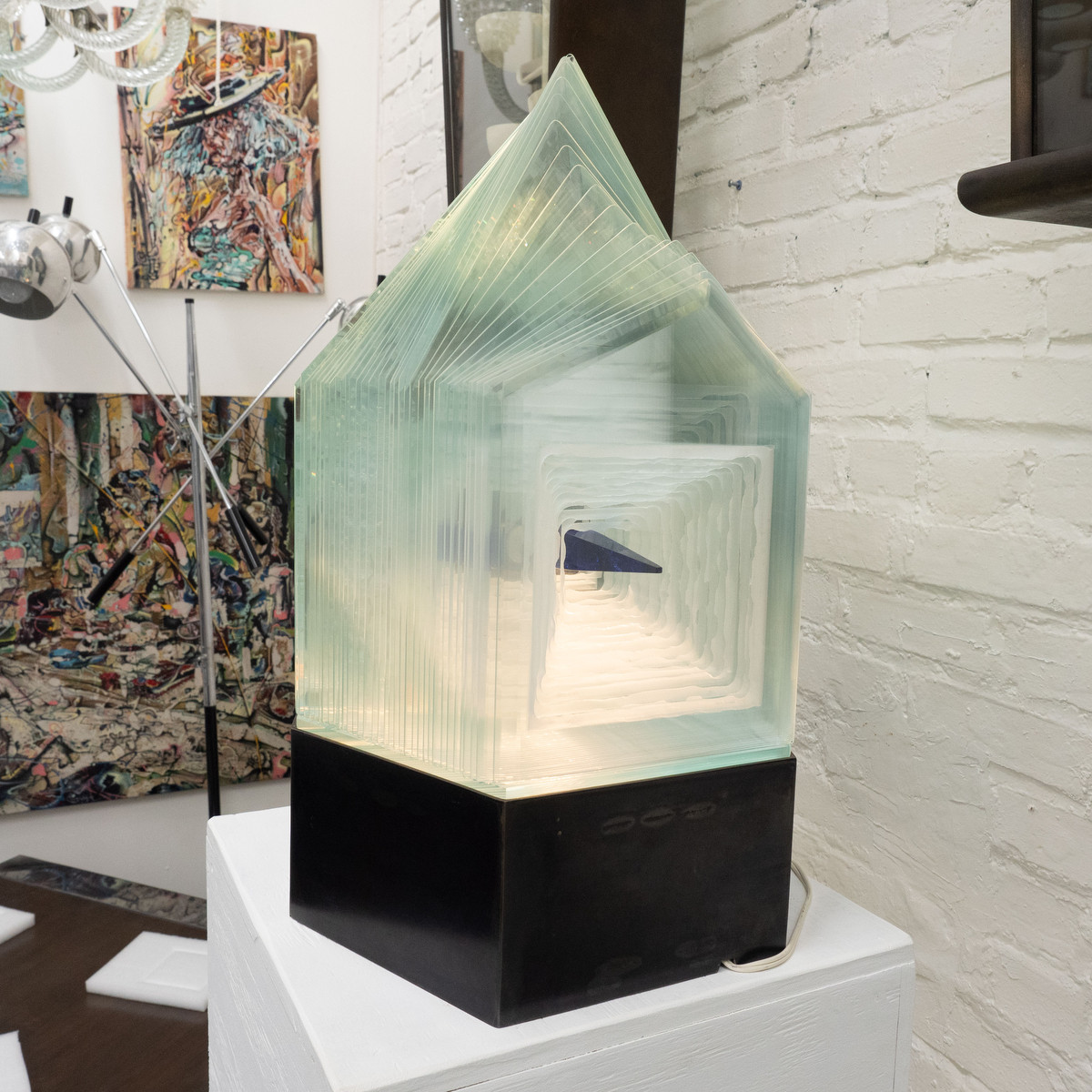 "Fleischwolf" art glass sculpture by Jiri Jelinek. Composed of numerous glass slabs with multiple techniques applied to create unique effects from all angles. Interior lit by LED in a custom-fit patinated steel base.