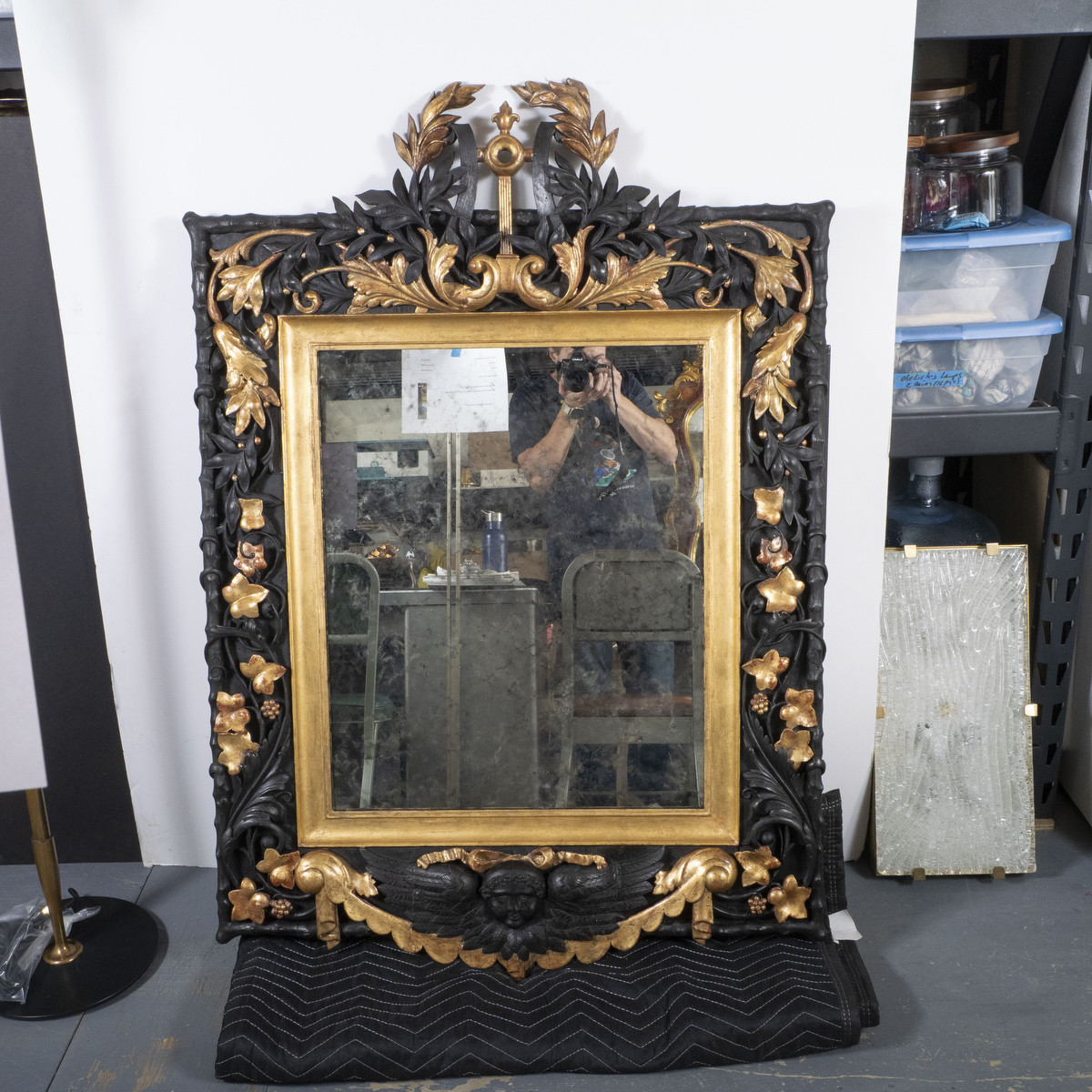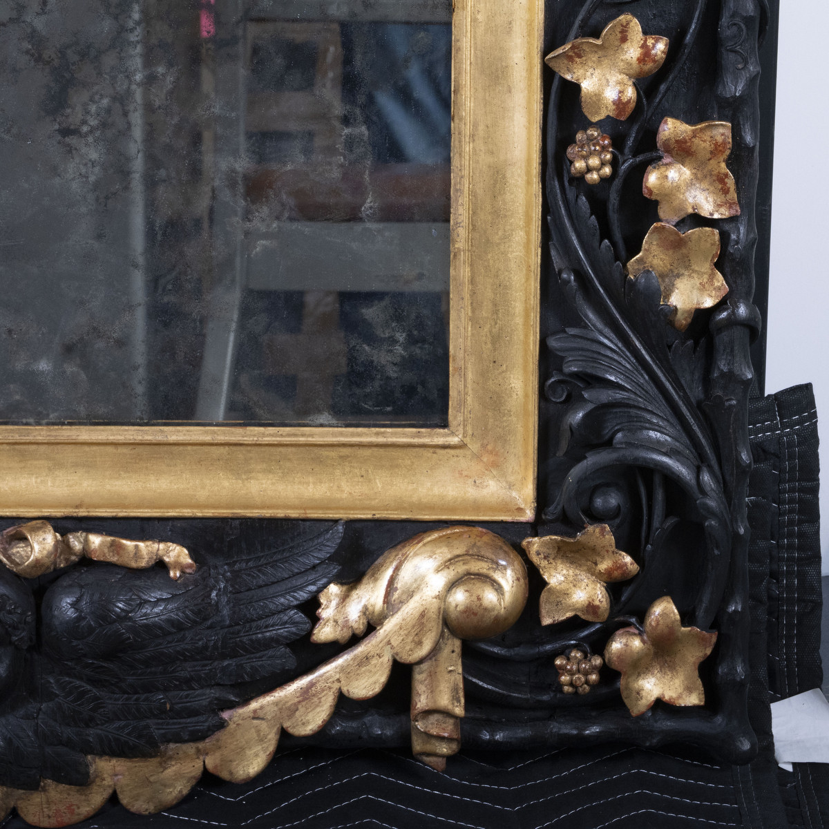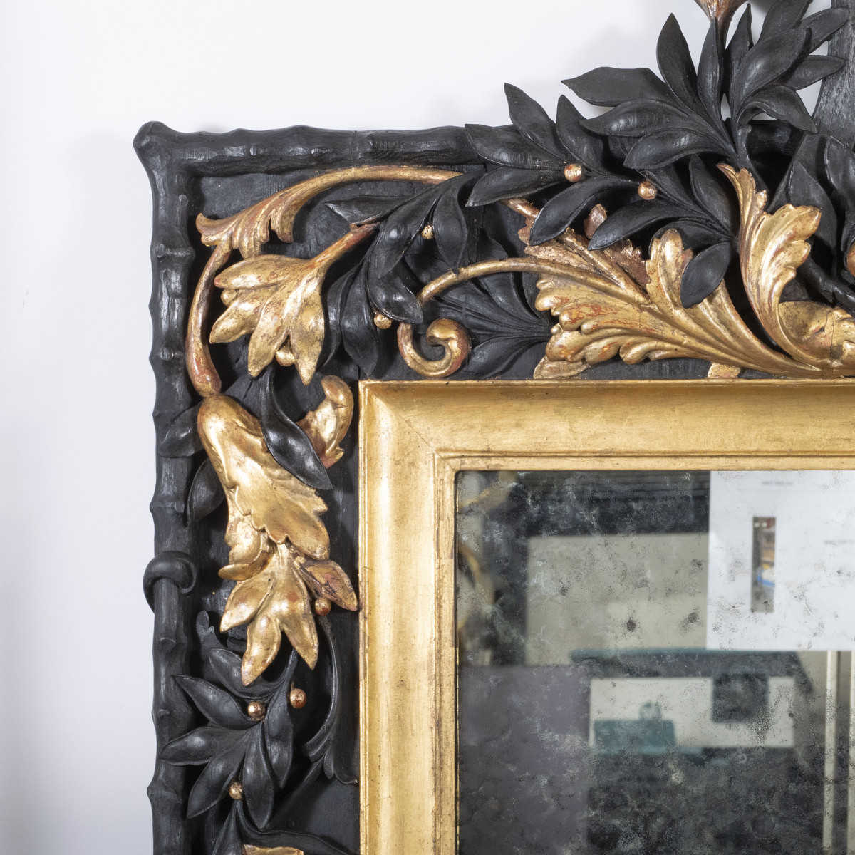Gilded and ebonized oak Baroque style mirror. Meticulously restored with 23K gold leaf detailing.