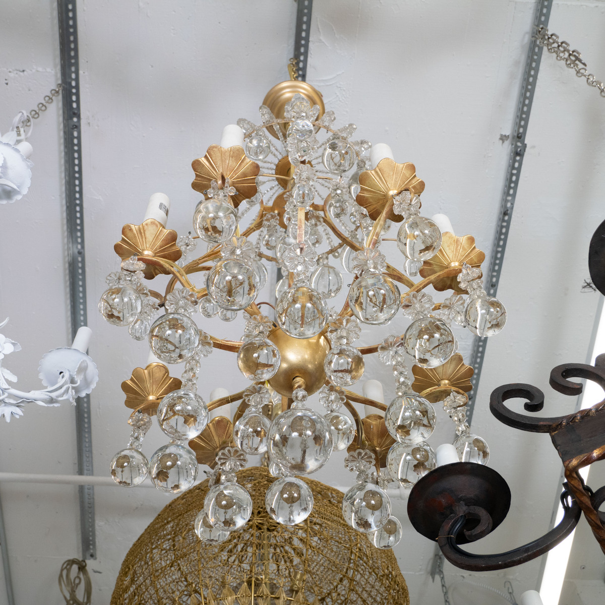 Gilt metal finish chandelier featuring various styles of crystal drop elements and cast flower bobeches.