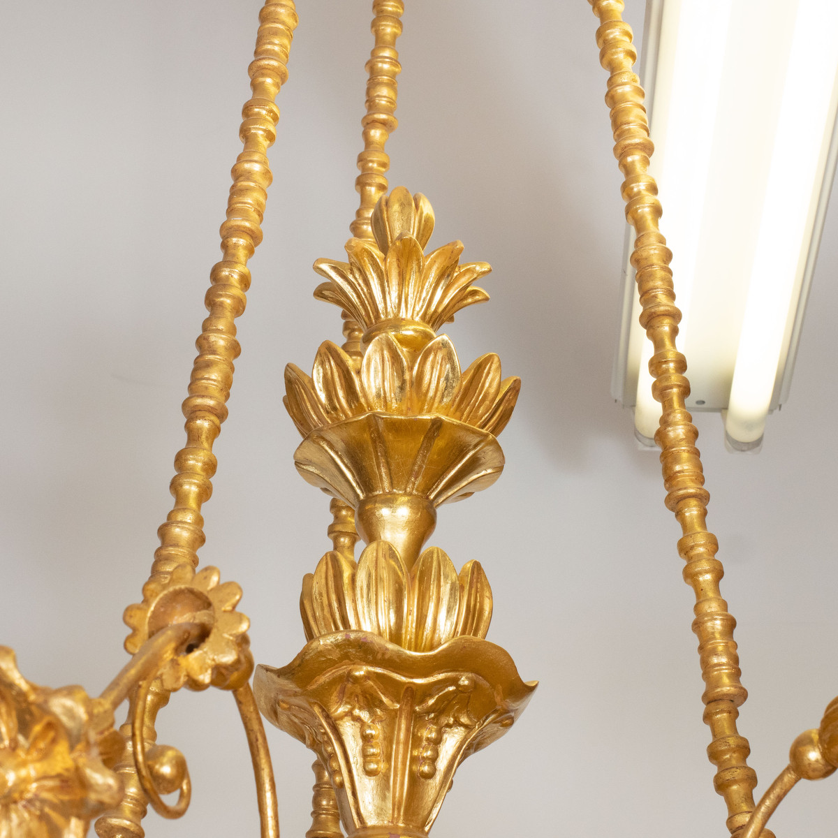 22k gold giltwood woodcarving chandelier with thin tendril arms and foliate motif by master woodworker Carlos Villegas