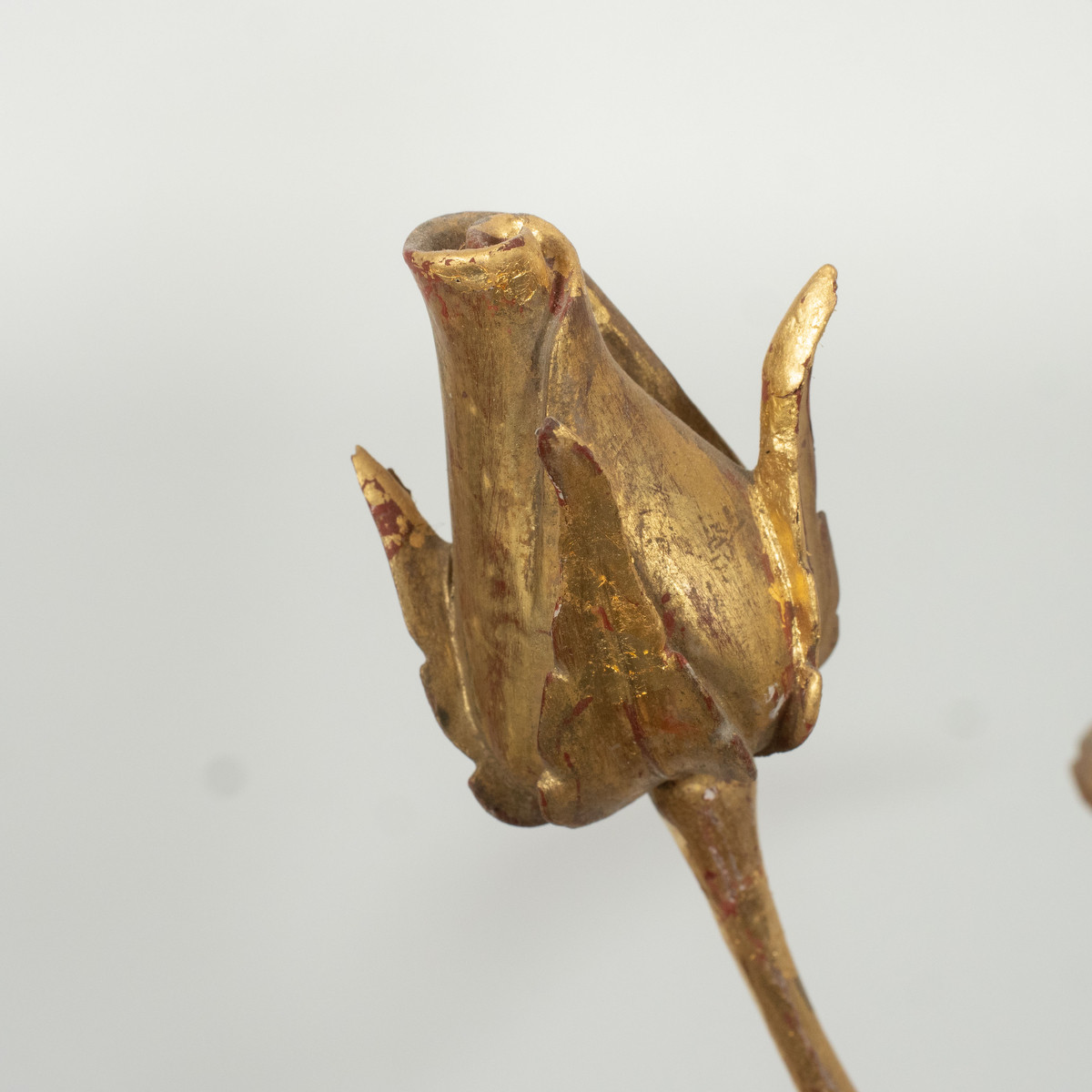22kt gold leaf woodcarving depicting a single rose in a pot in exquisite detail by master woodworker Carlos Villegas.