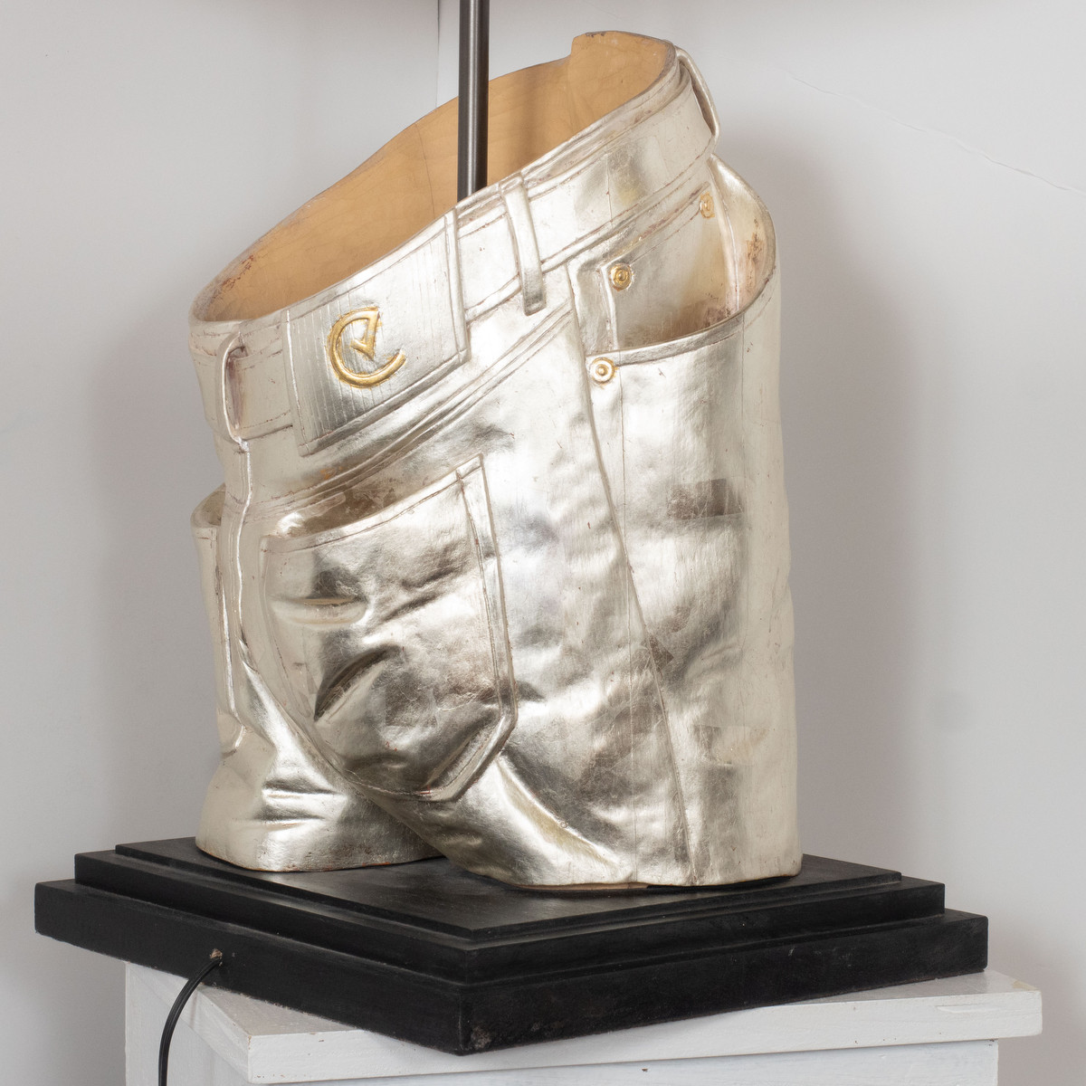 Single woodcarving table lamp with white gold finish depicting a pair of jeans in exquisite detail by master woodworker Carlos Villegas.