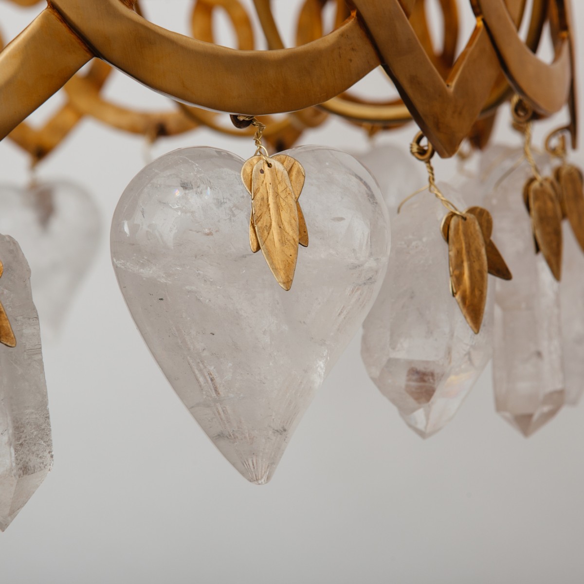 Gilt bronze chandelier with interlinked hearts and ovals frame featuring rocks crystal elements with foliage mounts. In the style of Robert Goossens.