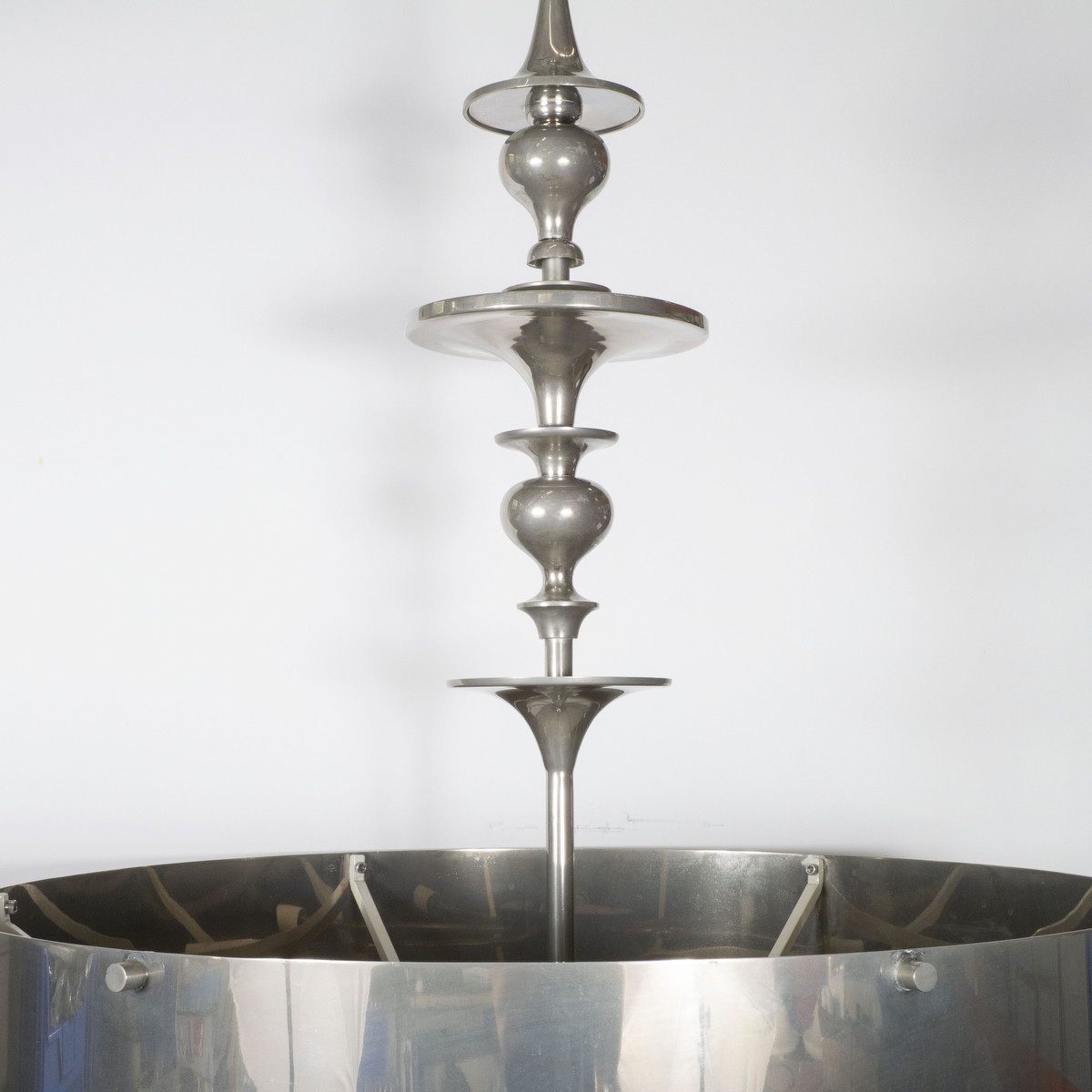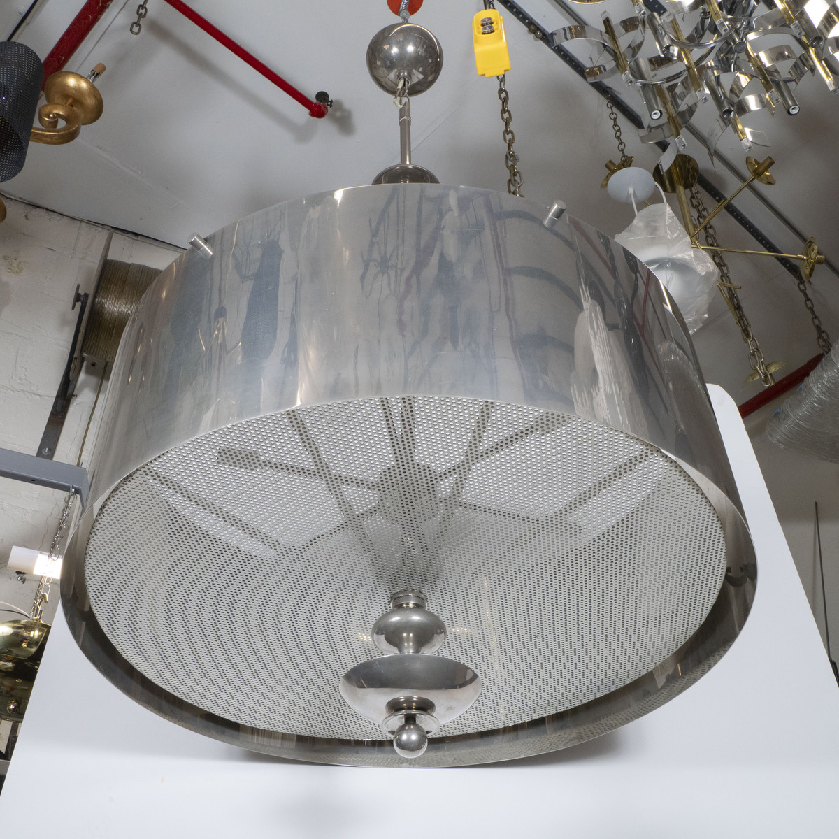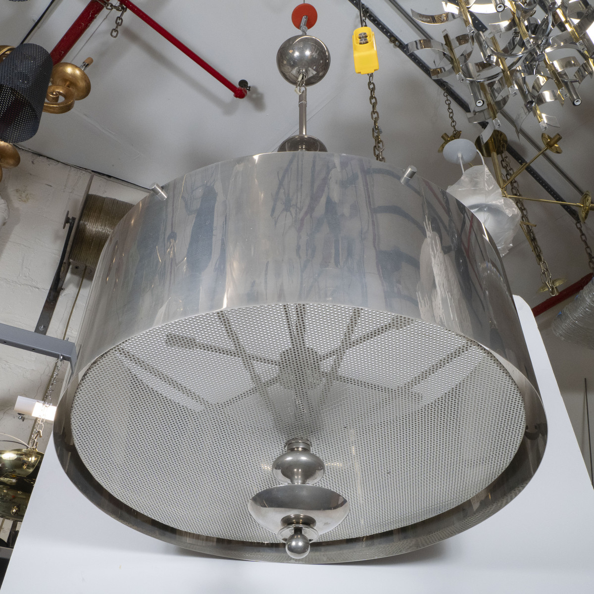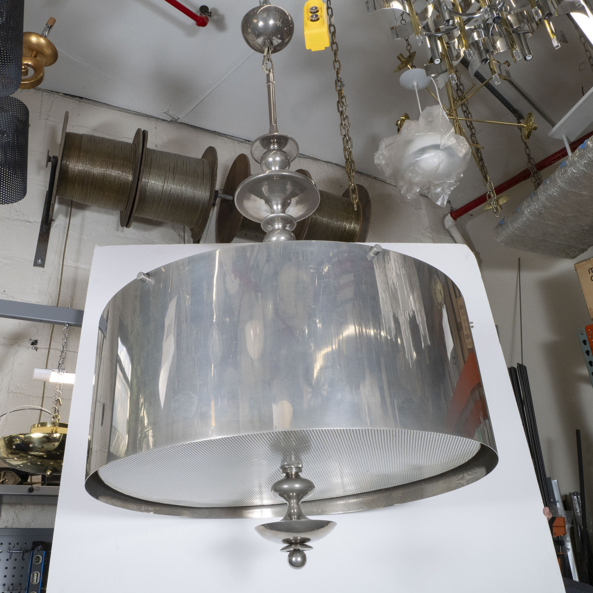 Large scale drum chandelier with mesh diffuser and spun details.