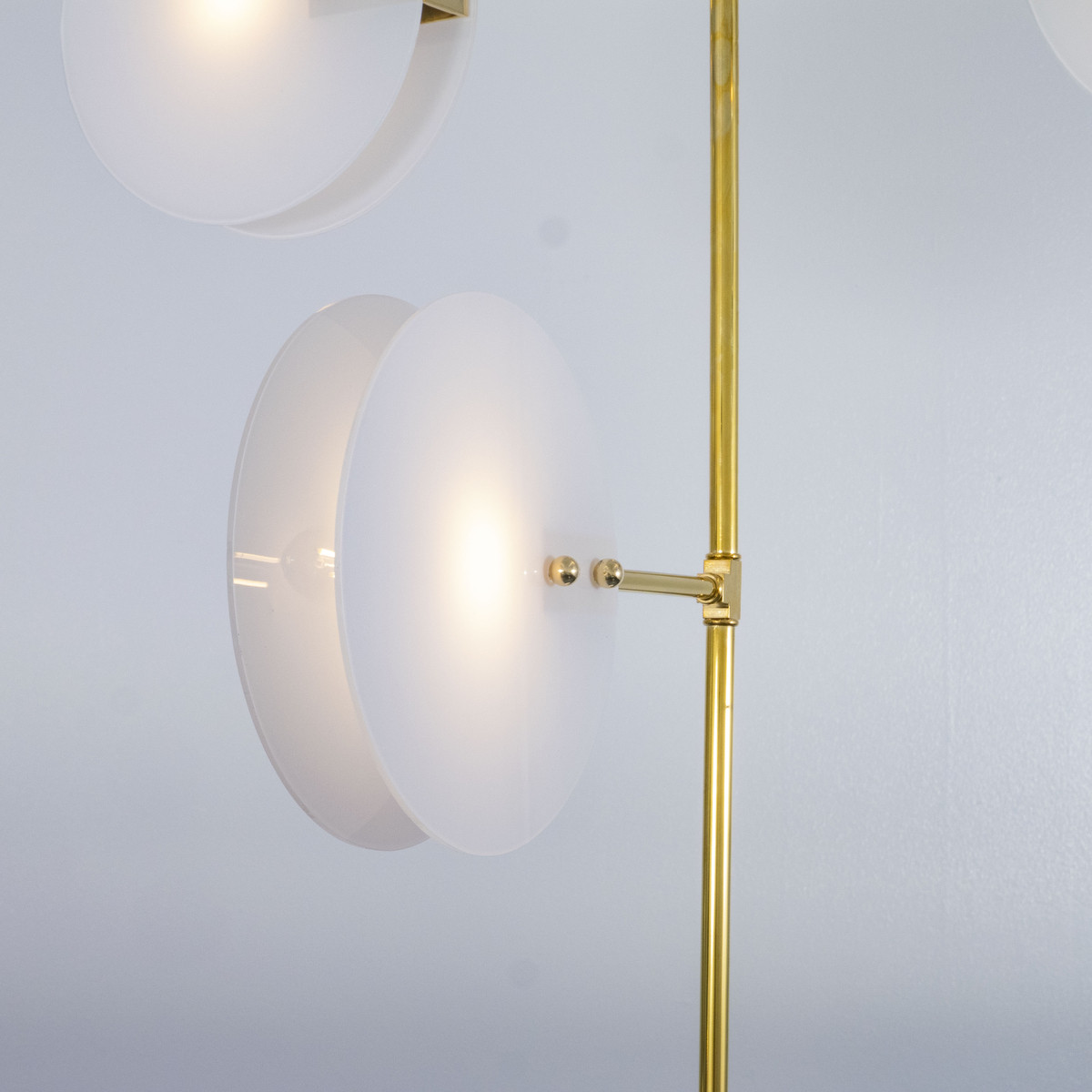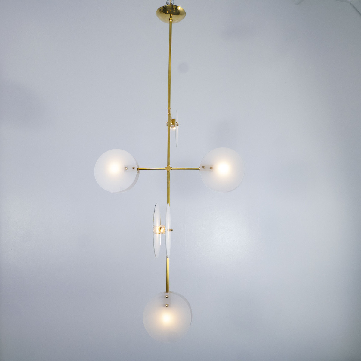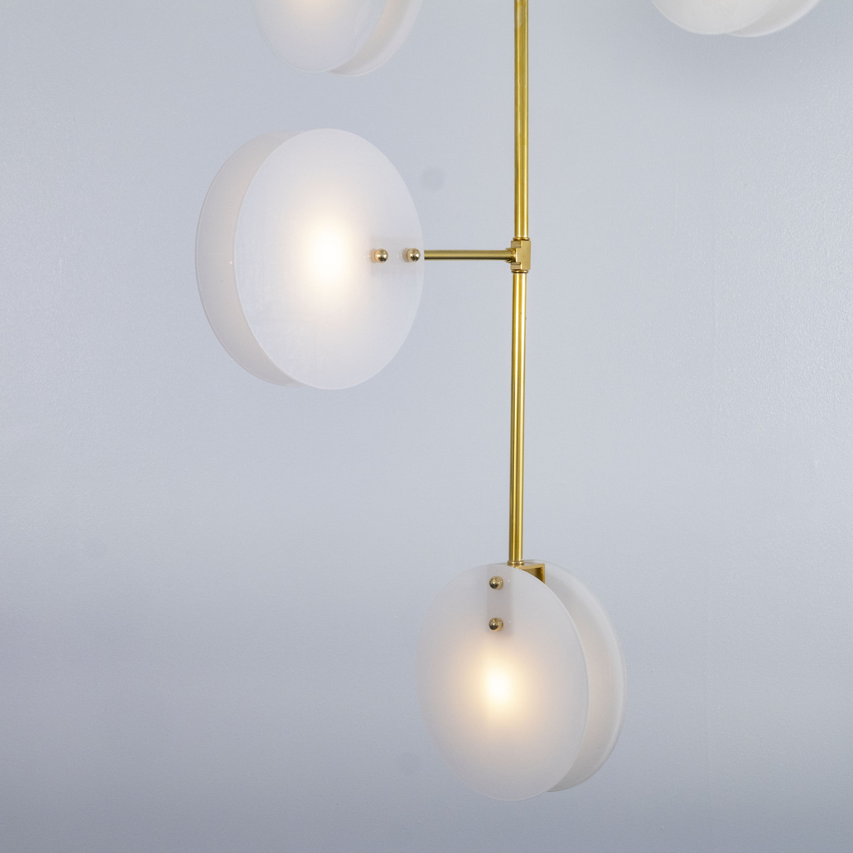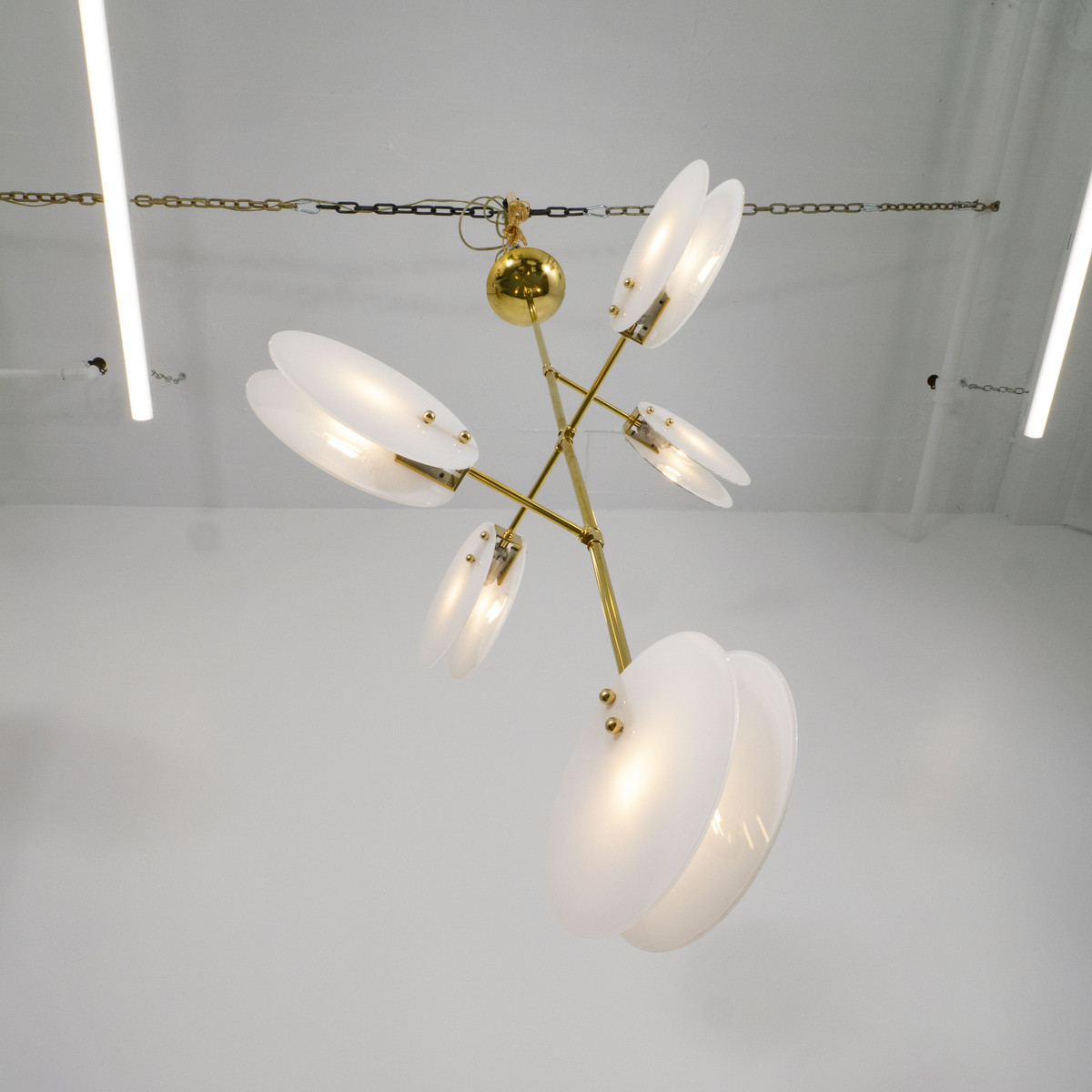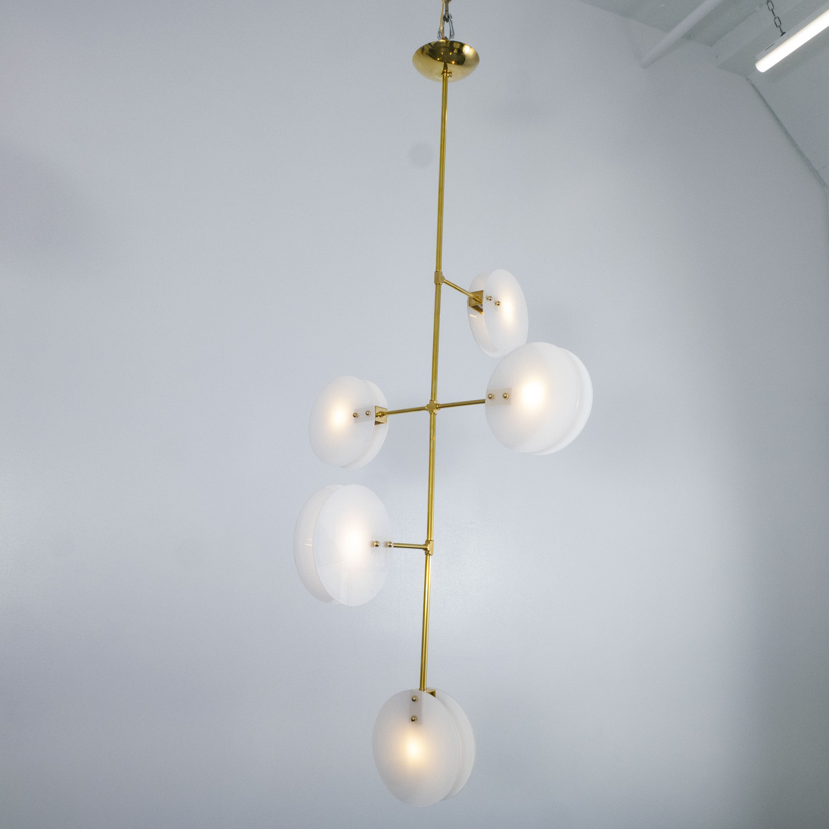 Modern brass chandelier with thin circular opaline glass shades