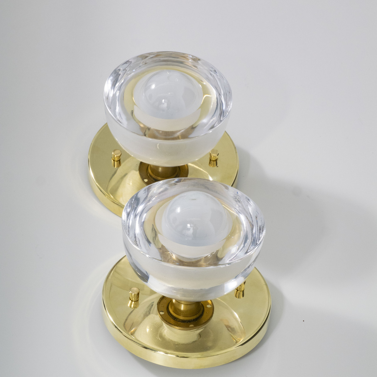 Pair of sconces with Murano glass cup shades and brass hardware. Light bulbs not included.