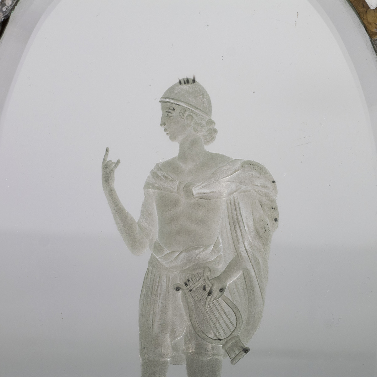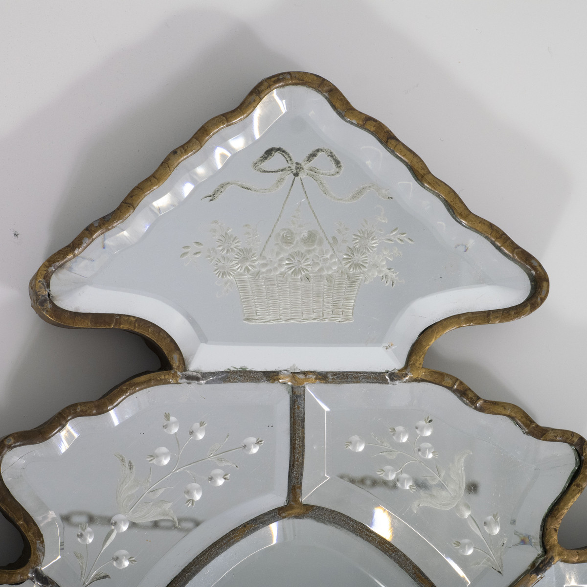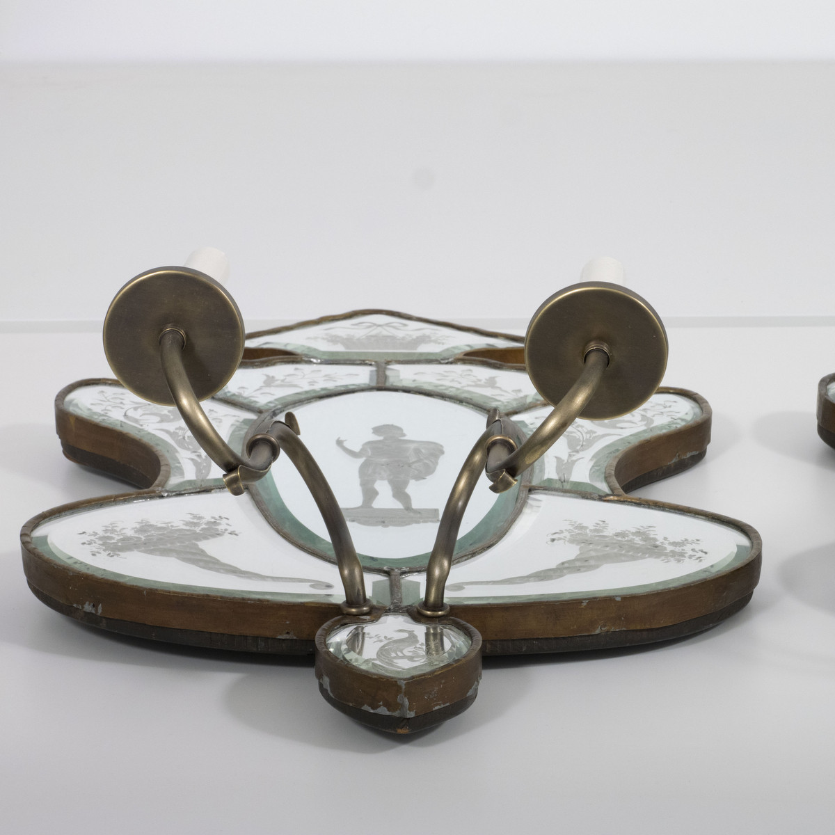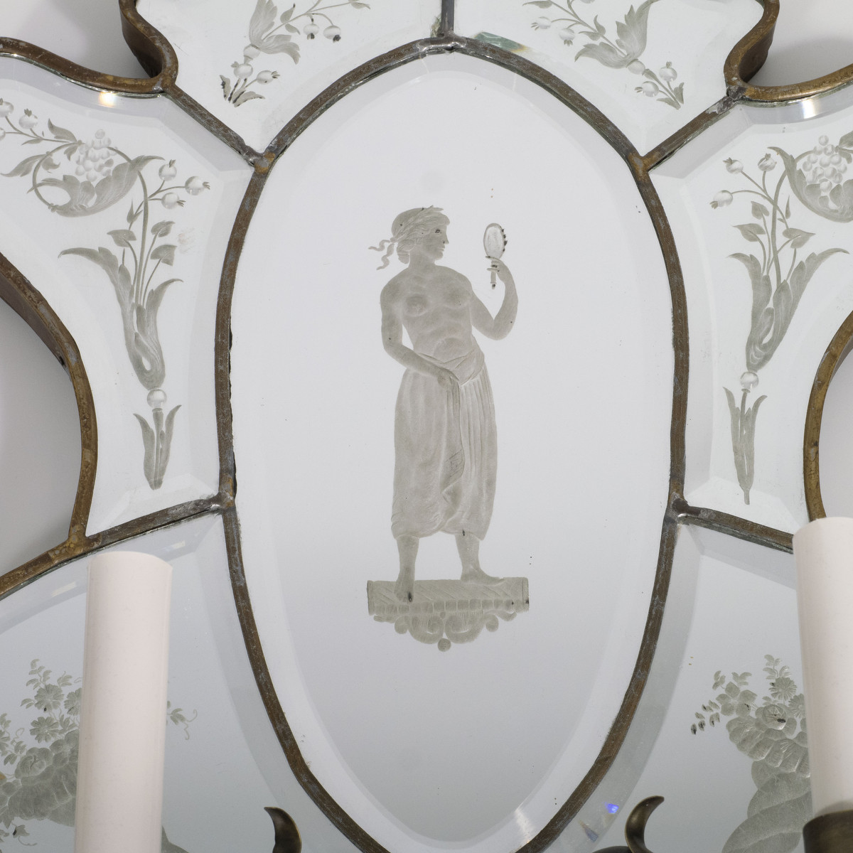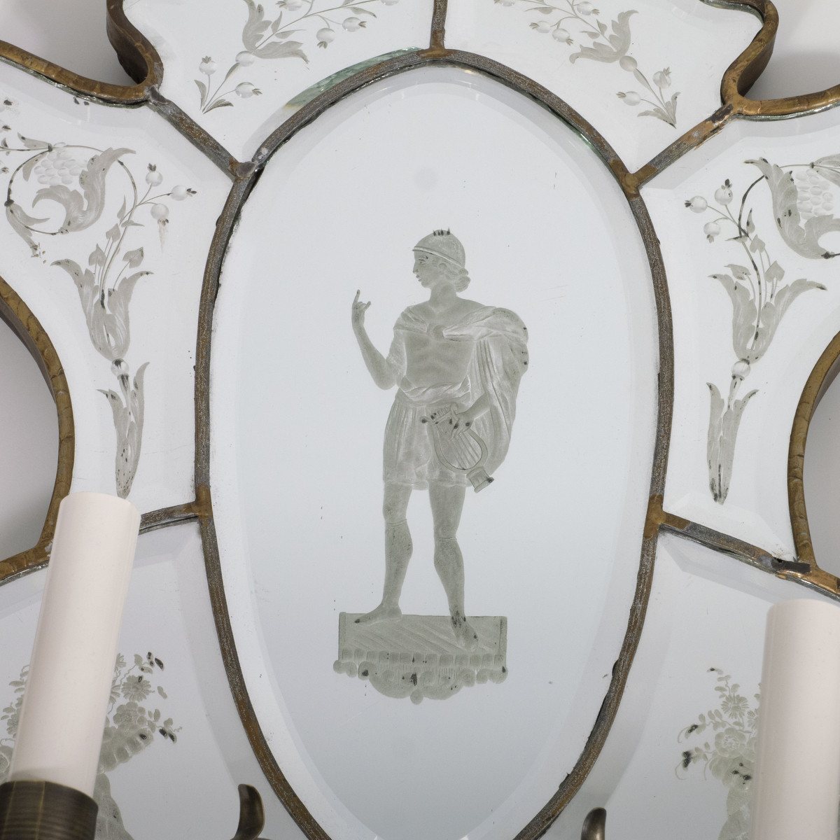 Pair of 19th century Venetian etch mirror wall sconces depicting classical forms and a floral motif.