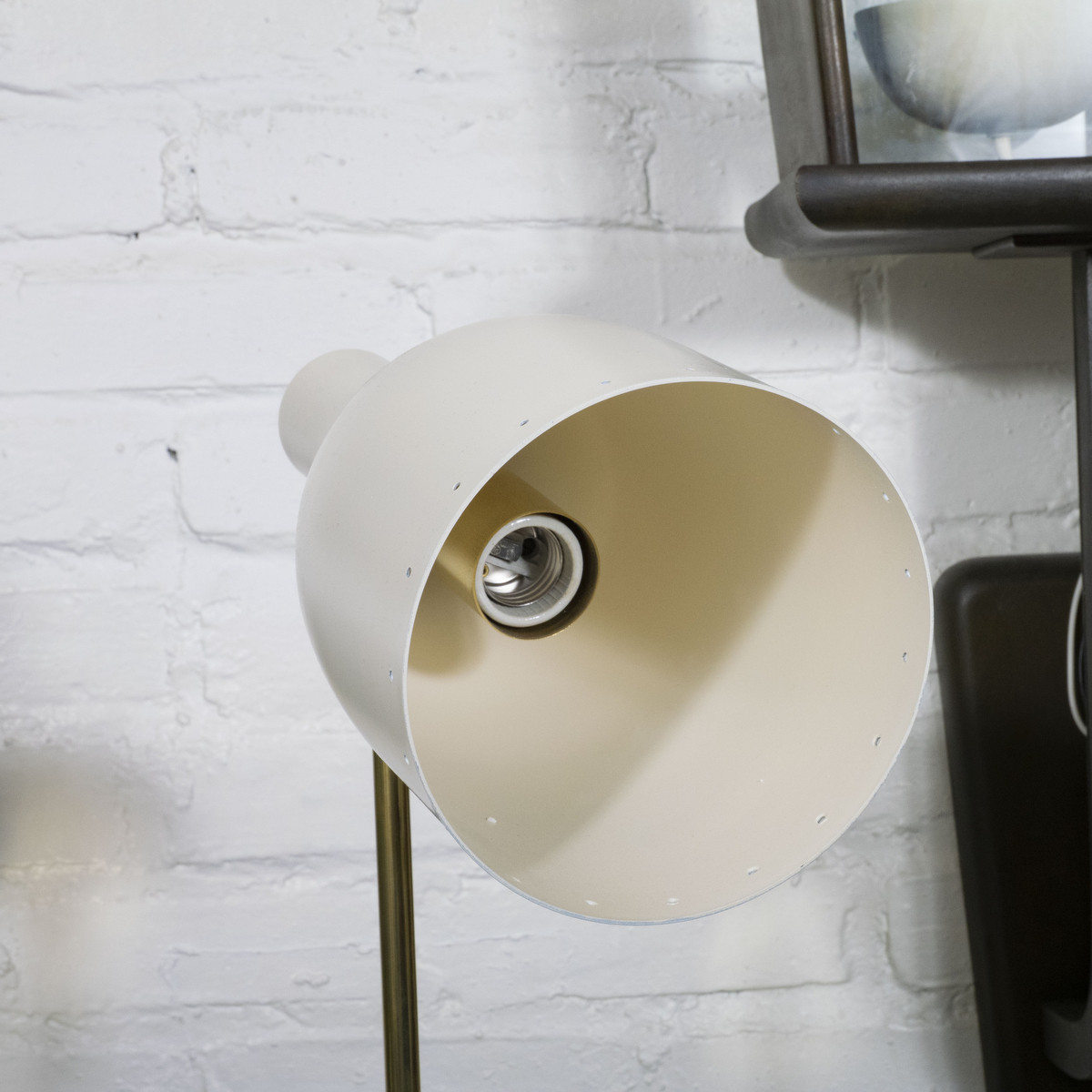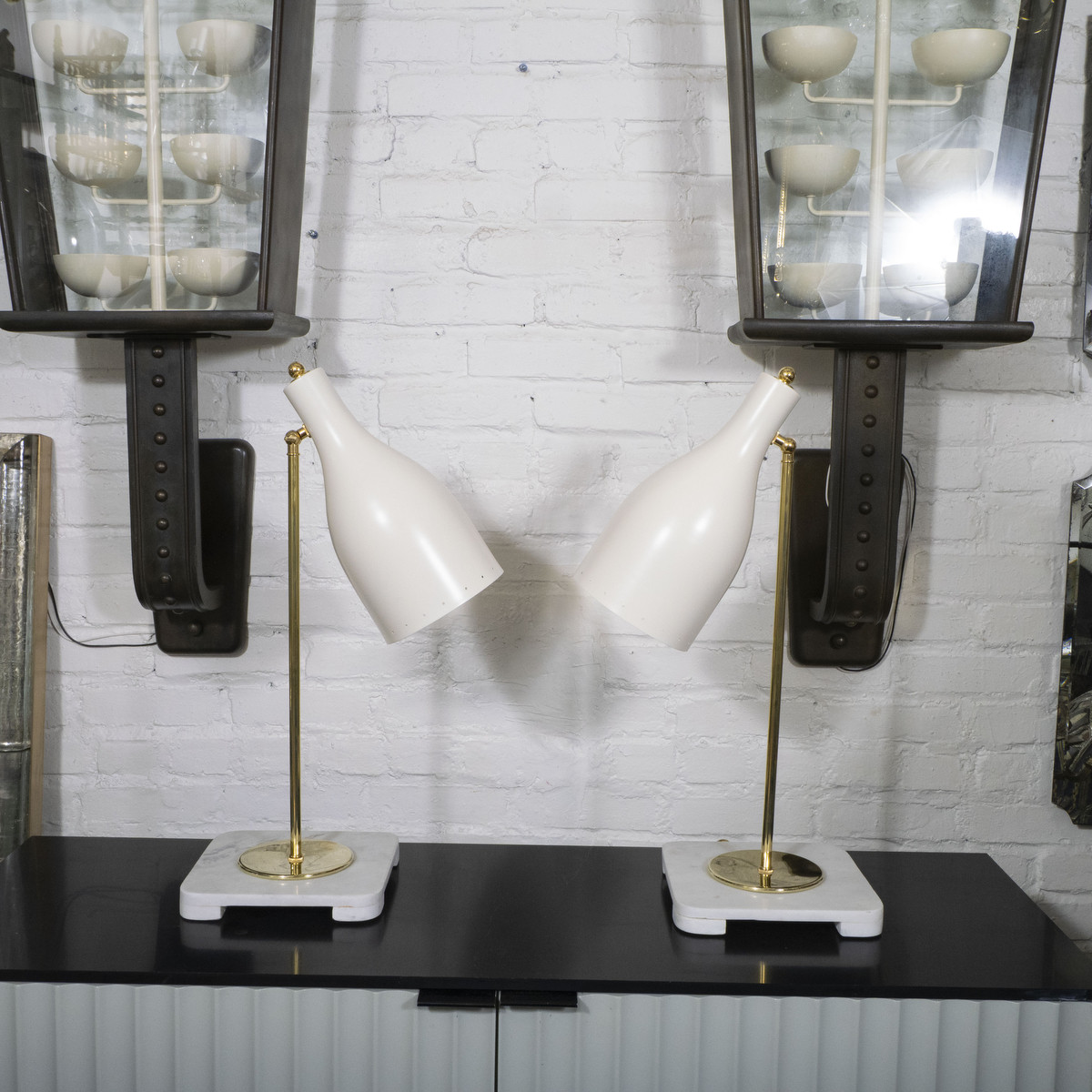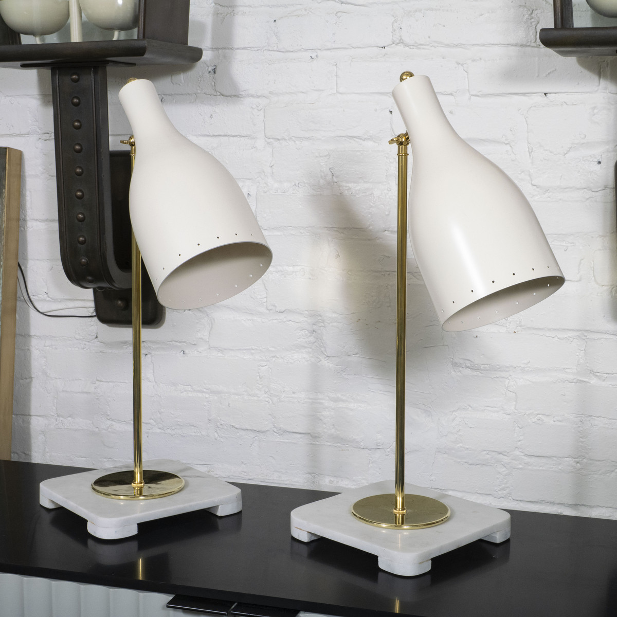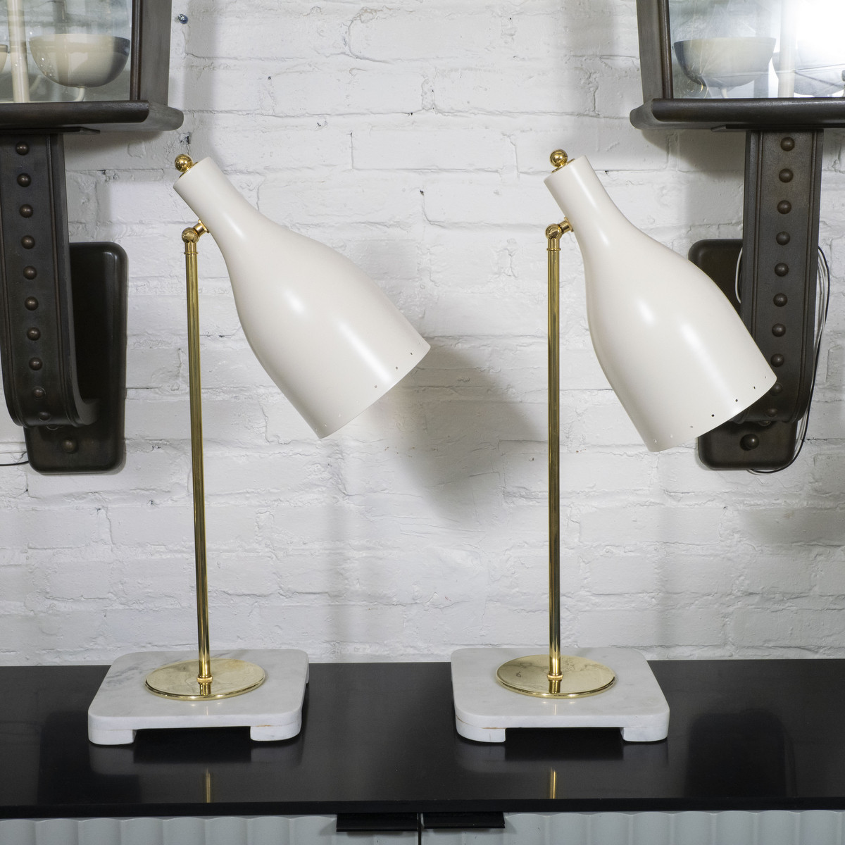 Pair of articulated Stilnovo style table lamps with pierced metal shades and marble bases. Base measures 9" square.