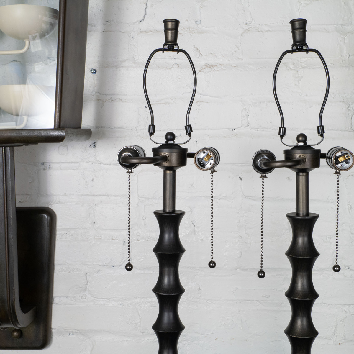 Pair of dark bronze finish, turned metal faux bamboo table lamps.