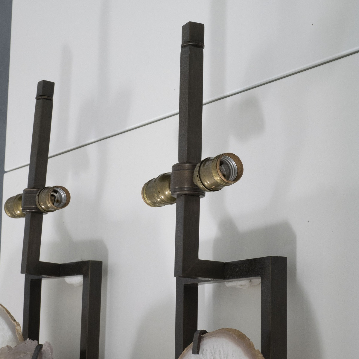 Pair of large geometric frame sconces with antique bronze finish and overlapping cut agate slabs. Shades measure 17" w x 8.5" d x 11" h. x2 E26 sockets and x3 E12 sockets.