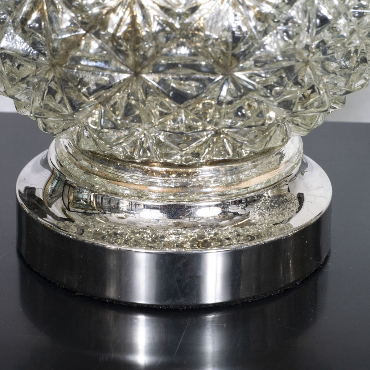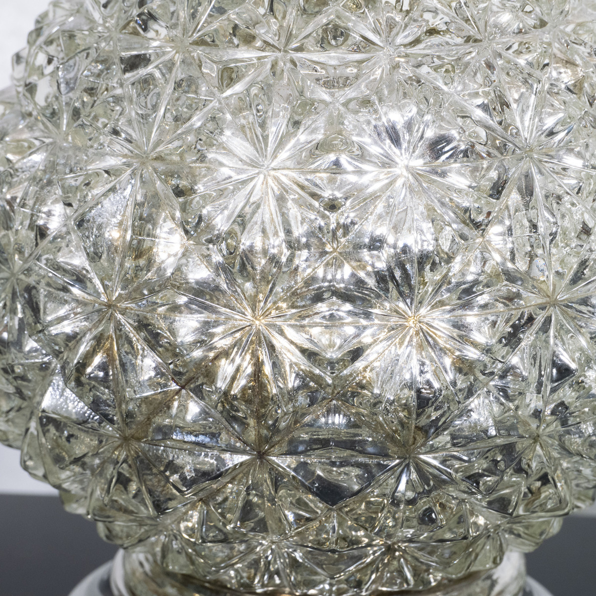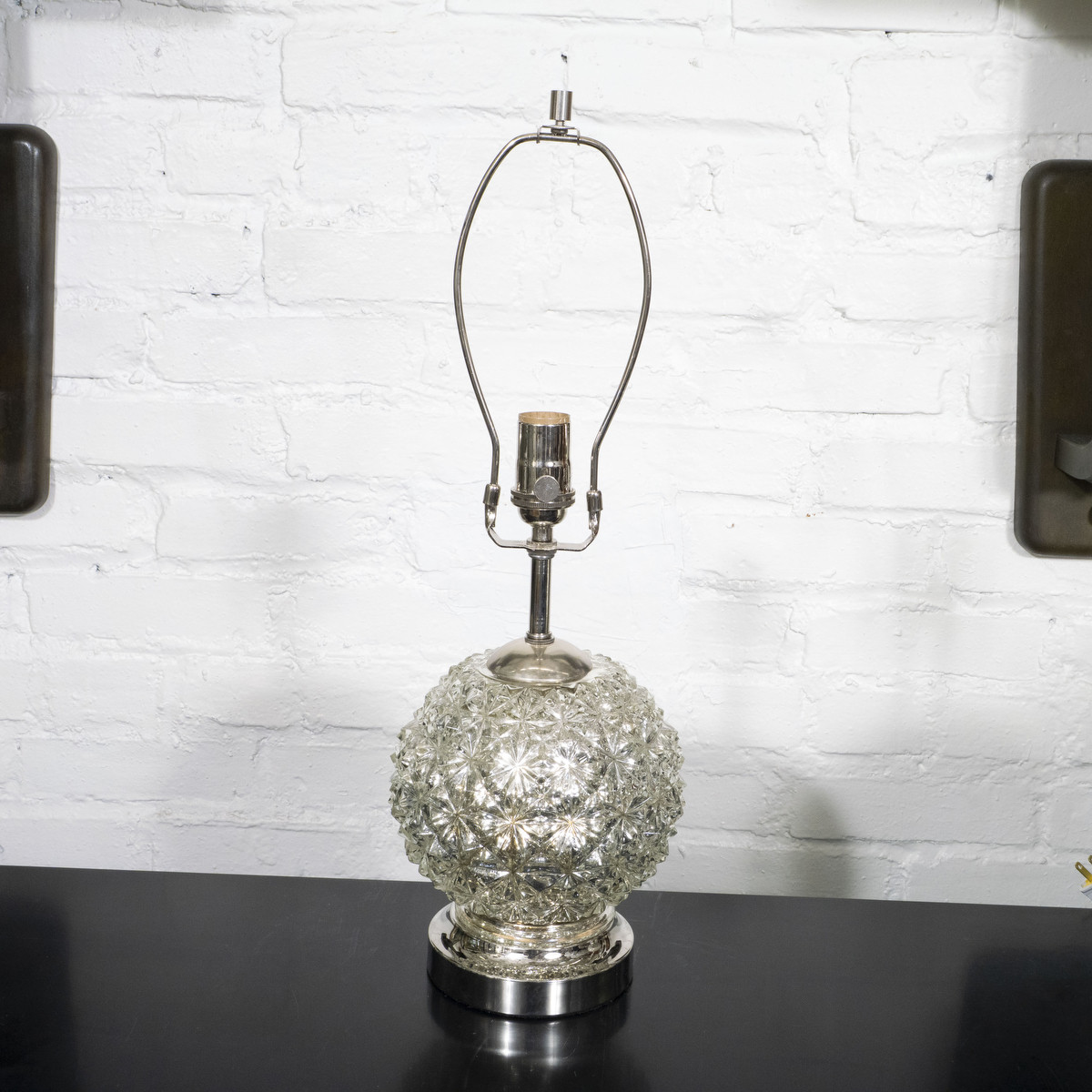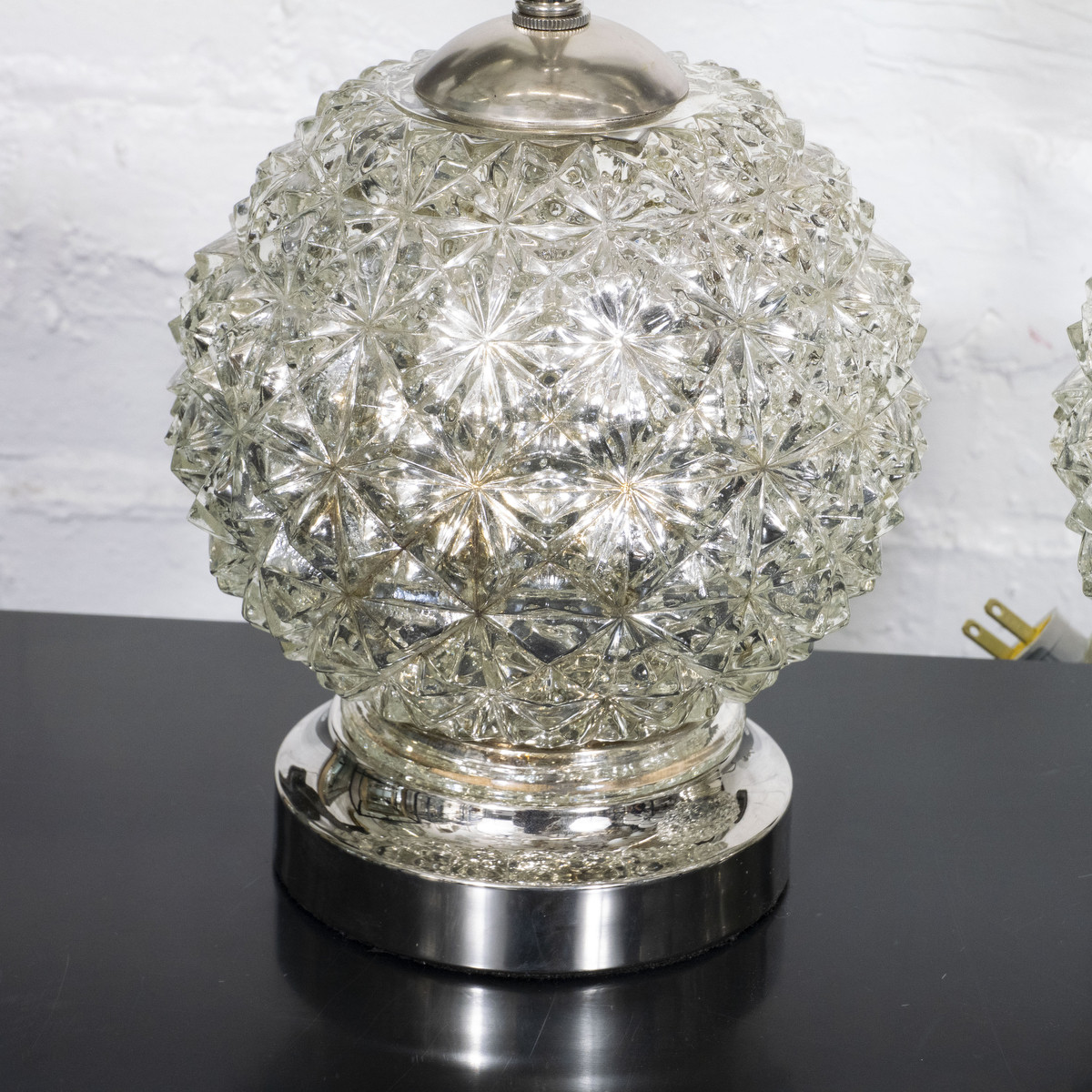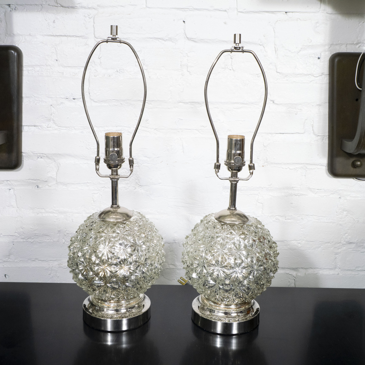 Pair of diamond patterned spherical mercury glass lamps