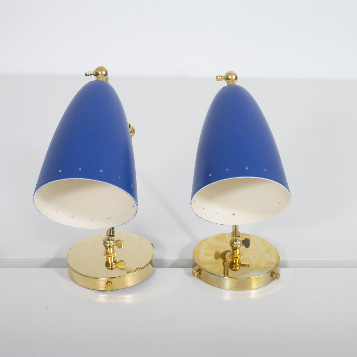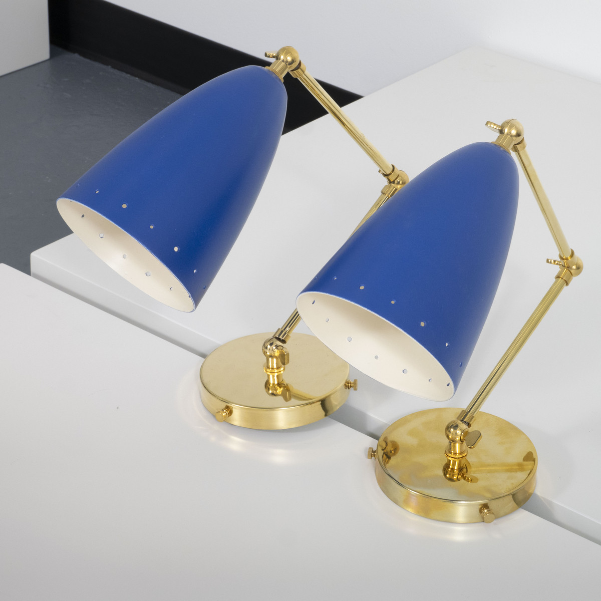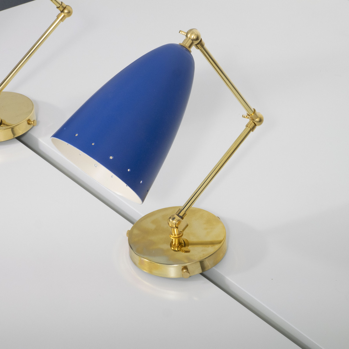 Pair of mid-century style articulated sconces with blue painted bullet shades. Depth and height measured as shown. Depth range of 11"-19".