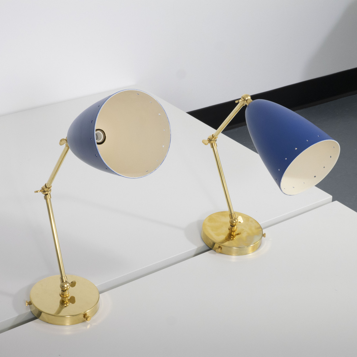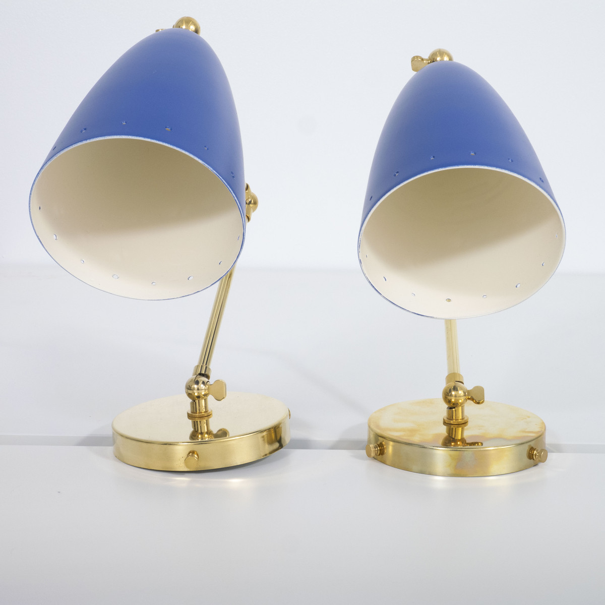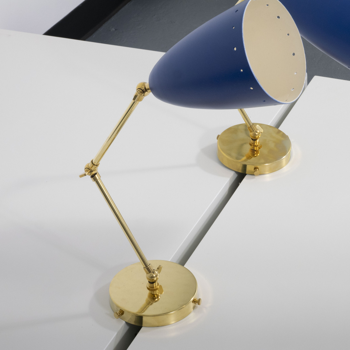 Pair of mid-century style articulated sconces with blue painted bullet shades. Depth and height measured as shown. Depth range of 11"-19".