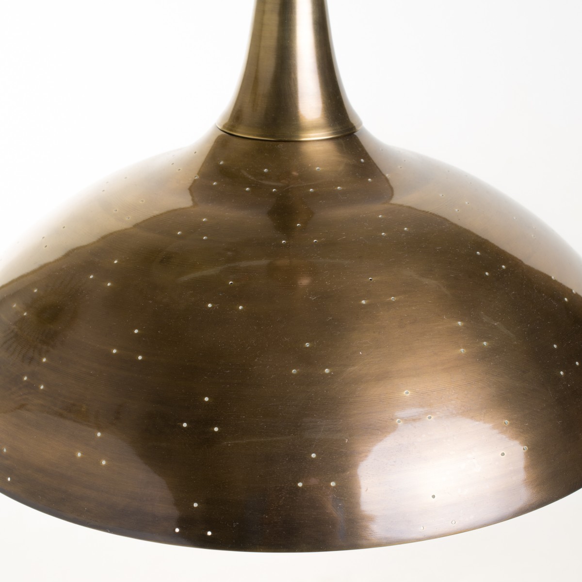 Antique brass and frosted glass lights with perforated brass shade. Beautiful effect when the light passes through metal shade. Down light is very soft due to the frosted glass diffuser. Four candelabra sockets. Max. 240 watt. Height can be adjusted by the cord. Finishes available in polished brass, satin brass, antique brass, polished nickel and satin nickel. Made to order.