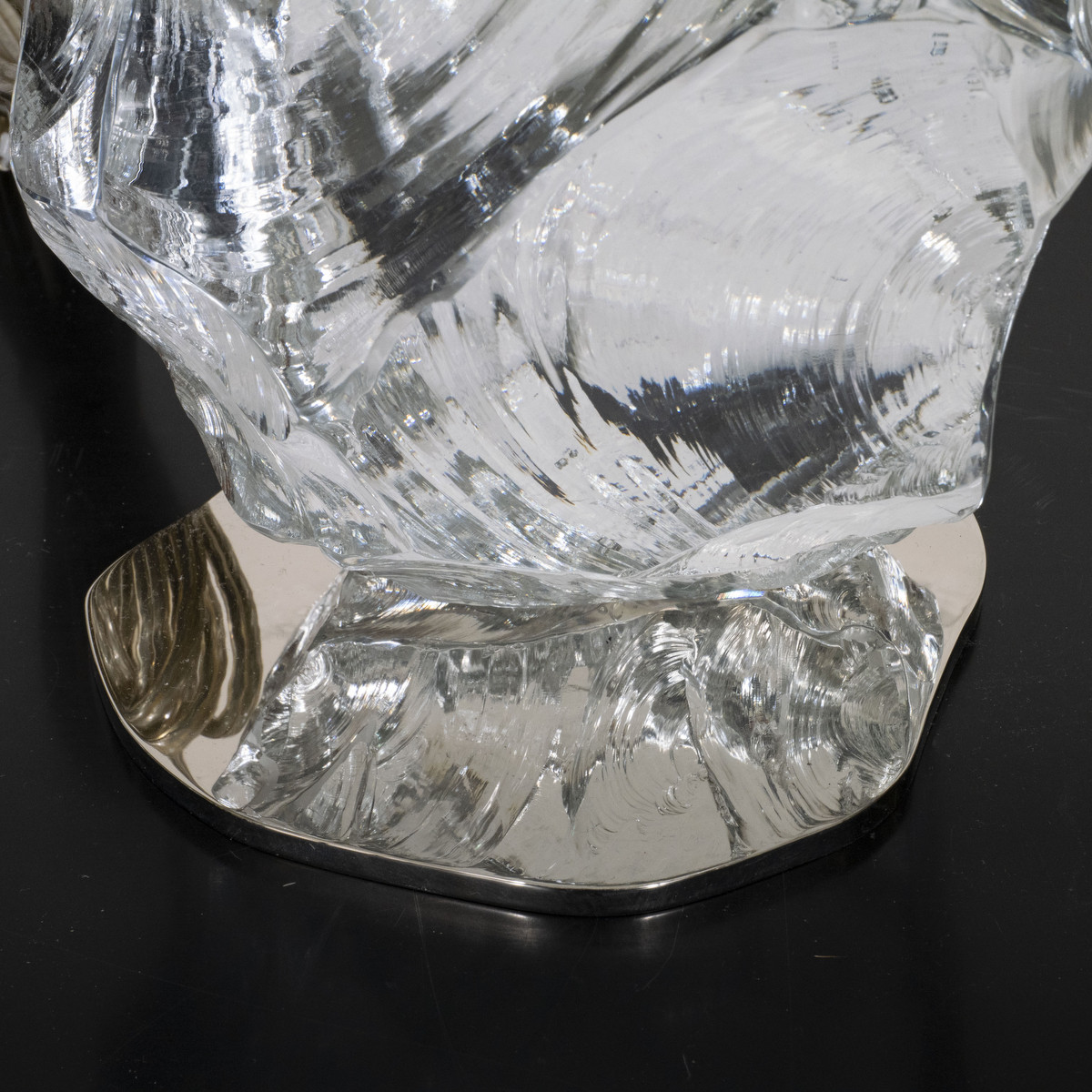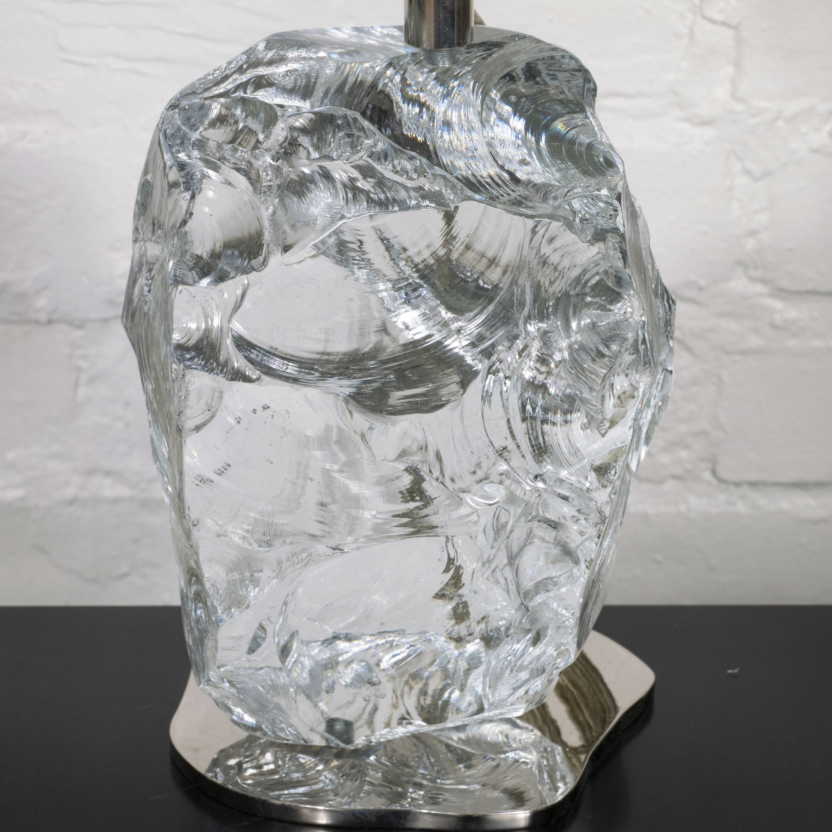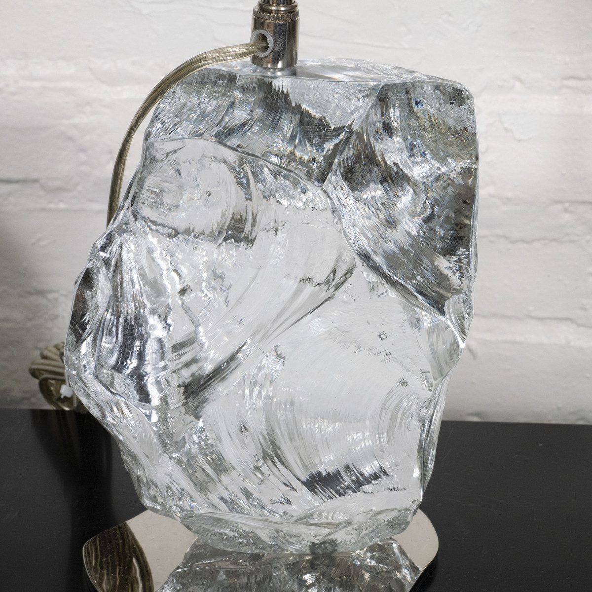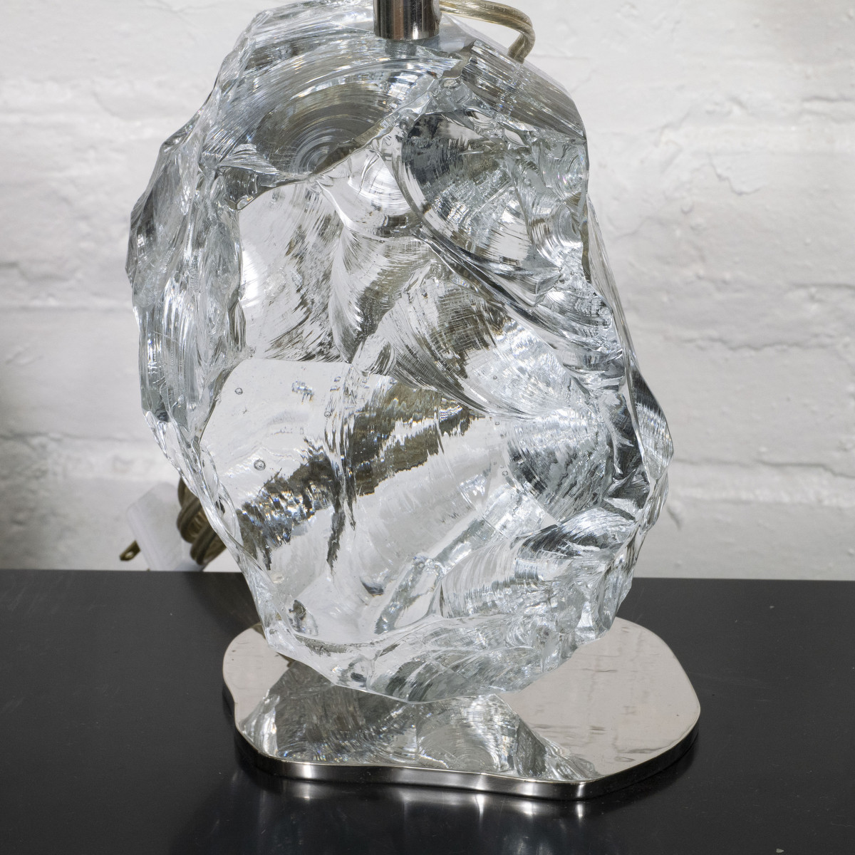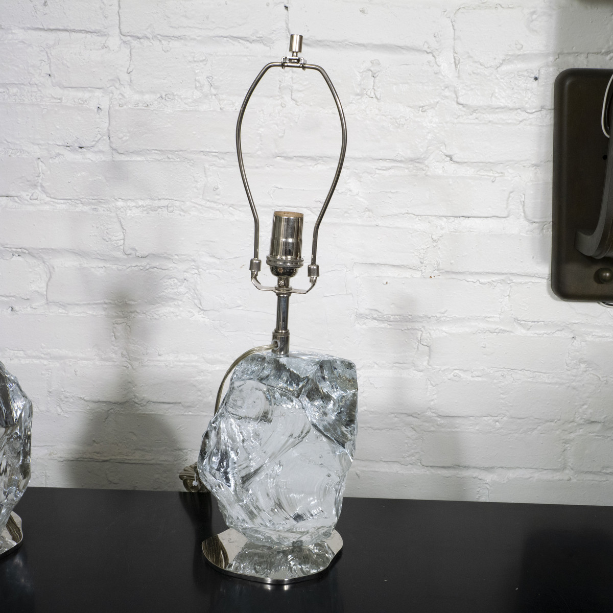 Pair of sculptural glass block "fragment" table lamps with organic nickel plated bases.