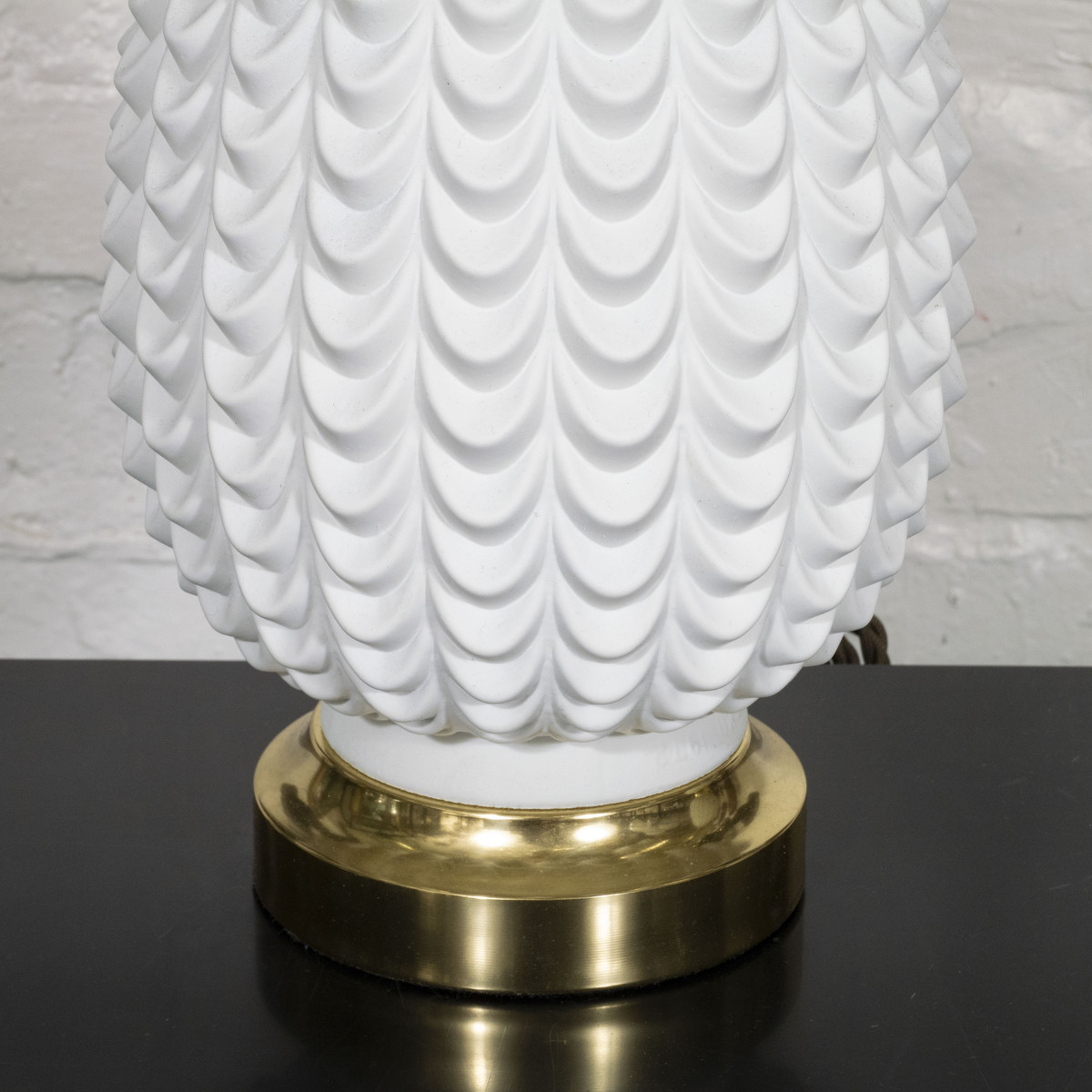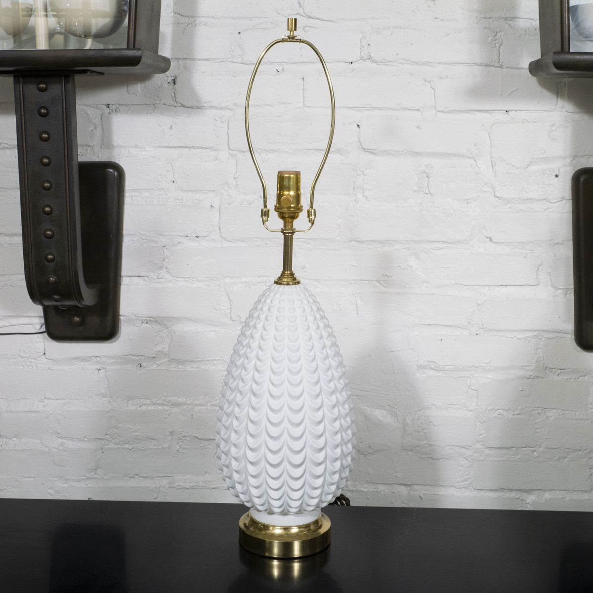Pair of white molded glass table lamps with brass hardware.