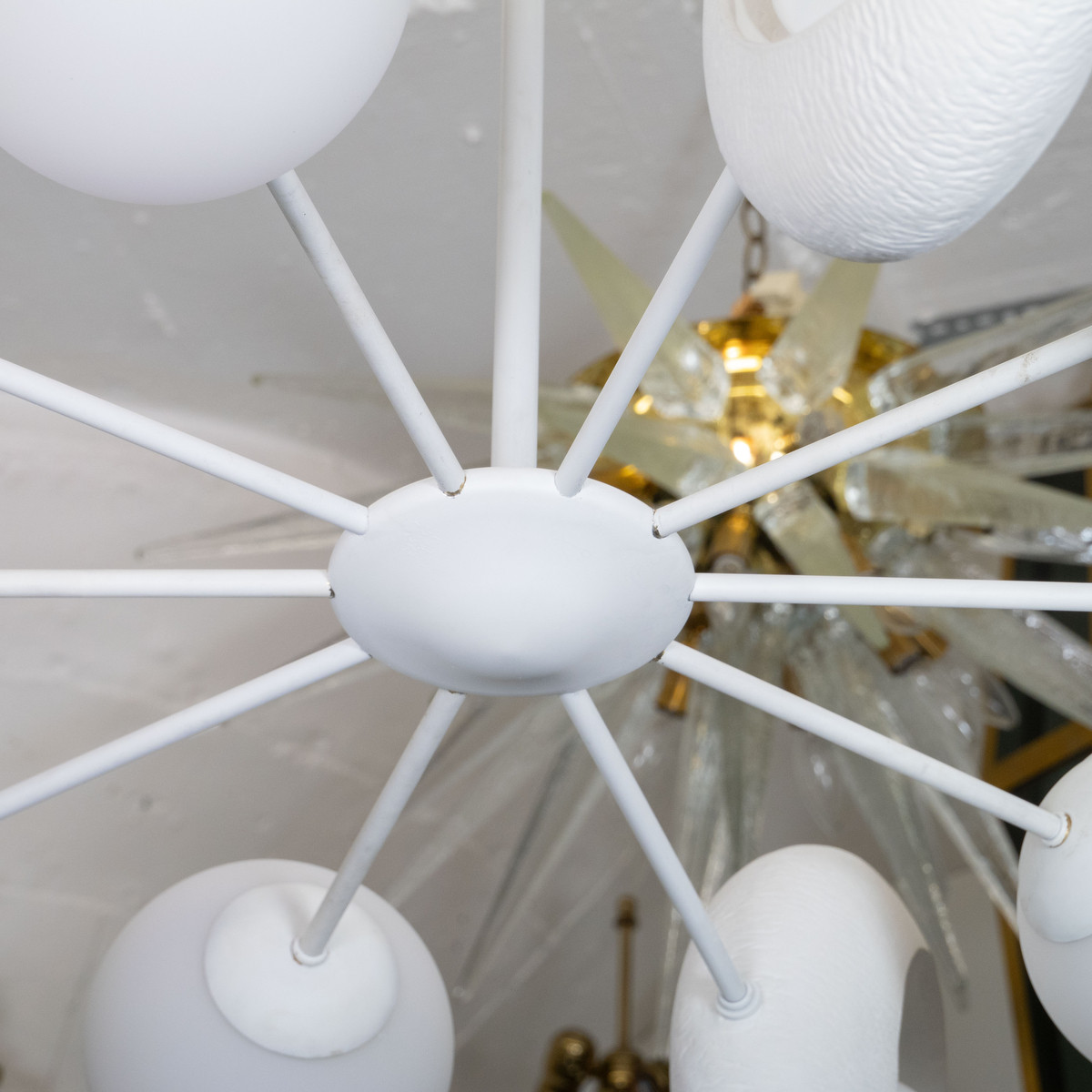 An exclusive custom design by Spark Interior. Enameled metal starburst style chandelier frame with arms terminating in plaster crescent moon shaped elements or glass globes. The moon elements as shown encase G40 bulbs to mesh with the cosmic aesthetic. The moon elements can also be rotated offering further customization. All other arms terminate in glass globes housing a single candelabra socket each.