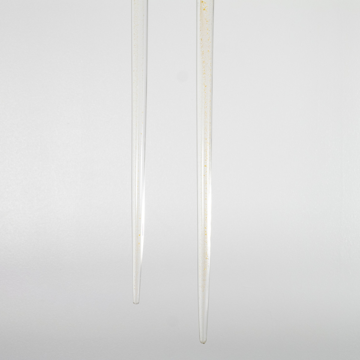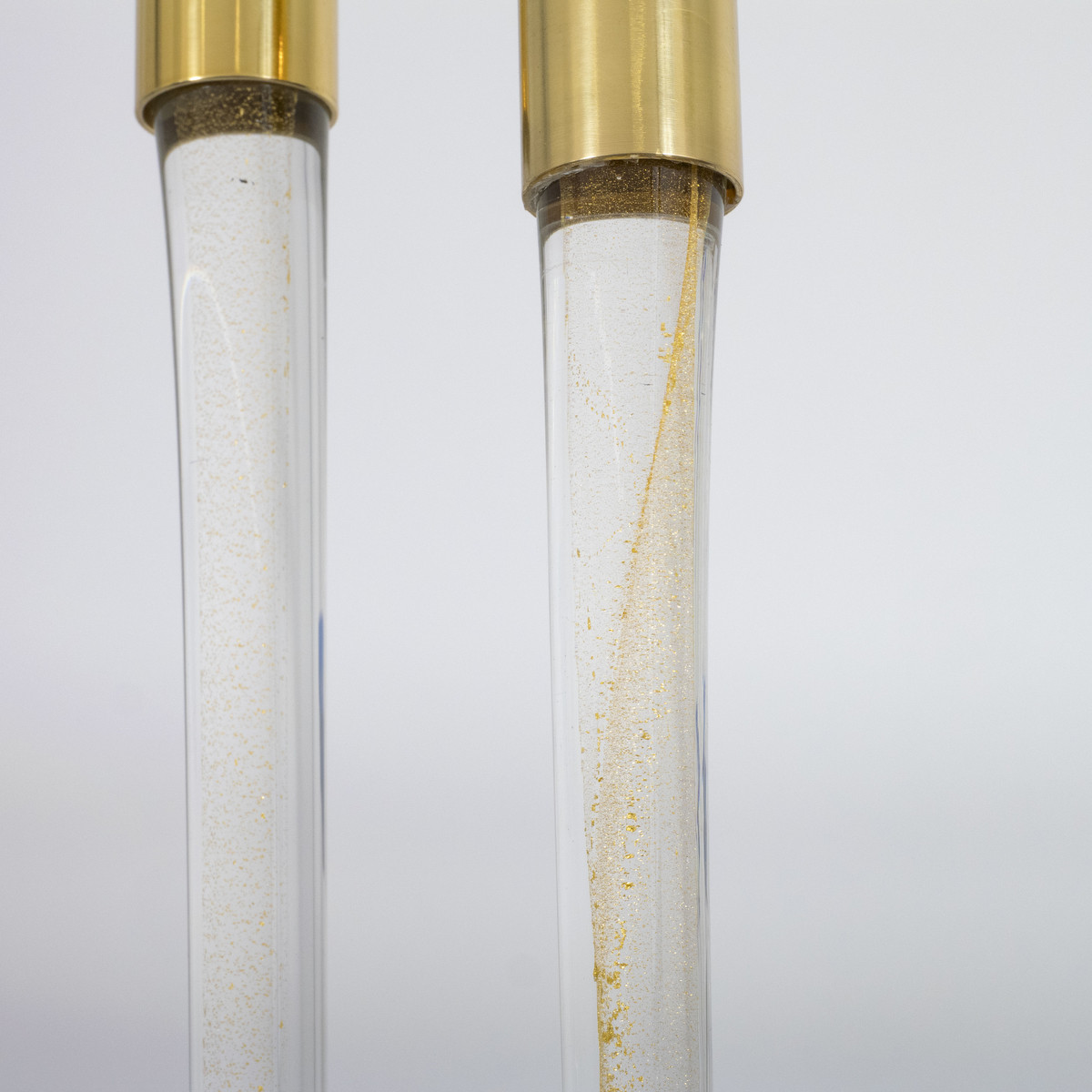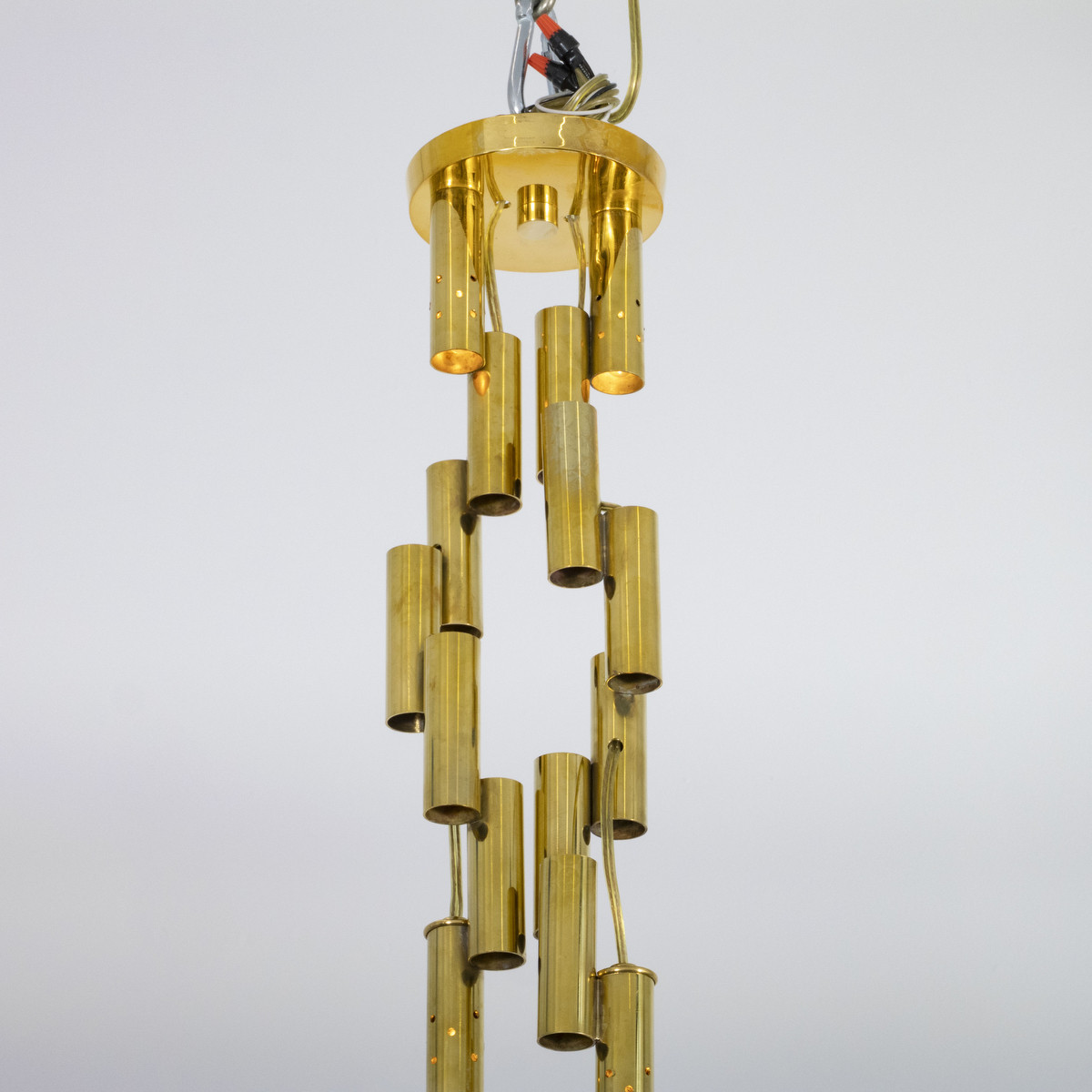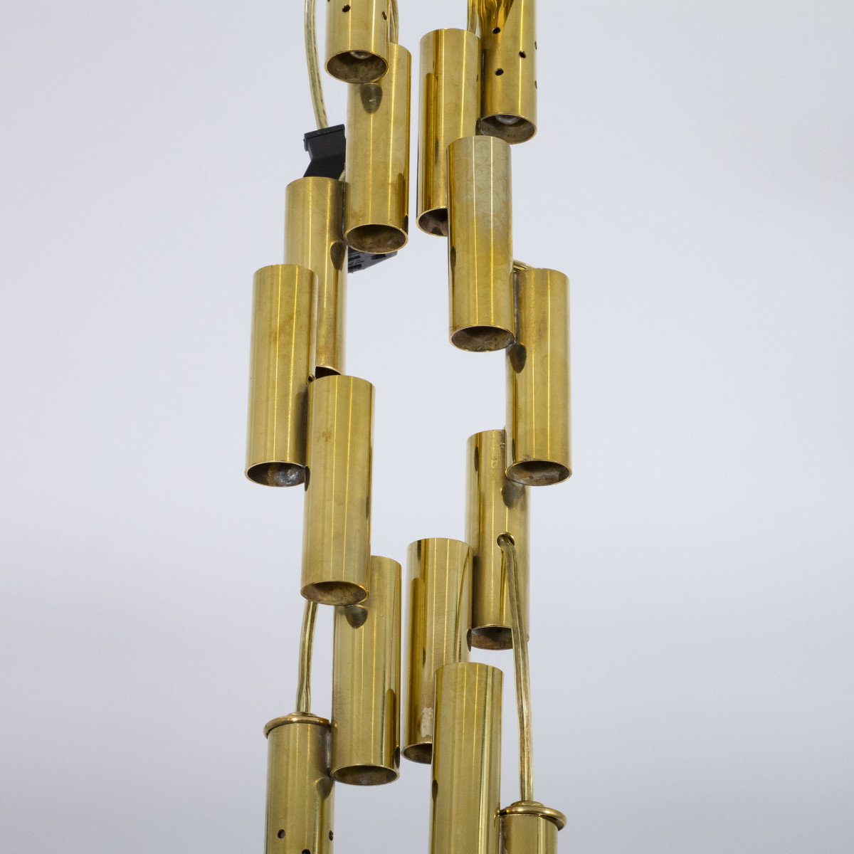 Sculptural brass flush mount ceiling light composed of cascading brass cylinders with cylindrical "icicle" elements.
