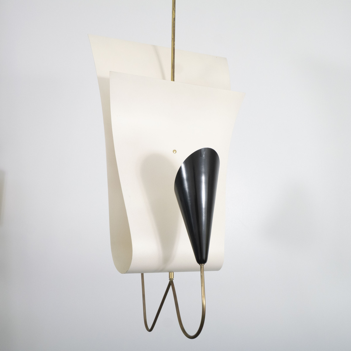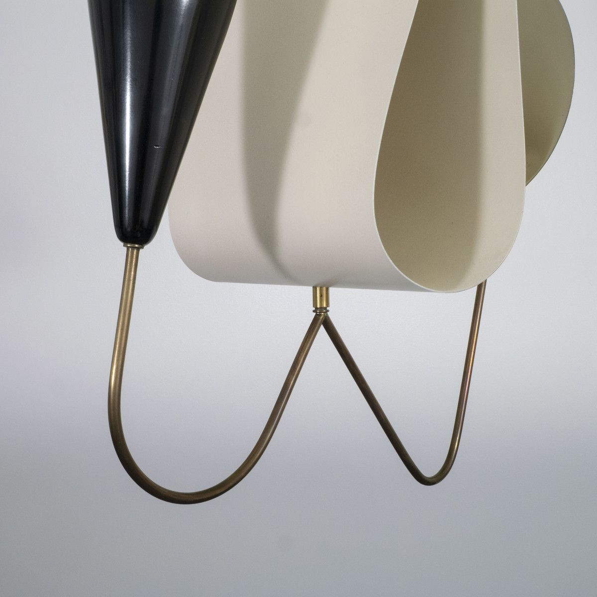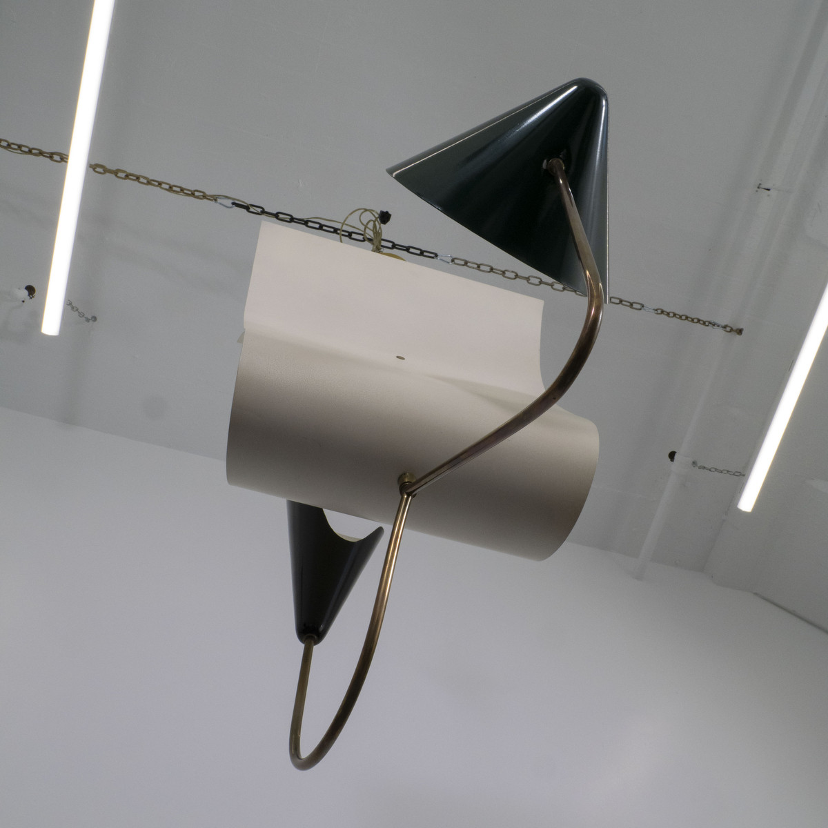Sculptural chandelier with "wavy cloth" metal detail at center and bullet shades attributed to Gilardi and Barzaghi. UL certified. x1 E26 and x1 E12 socket.