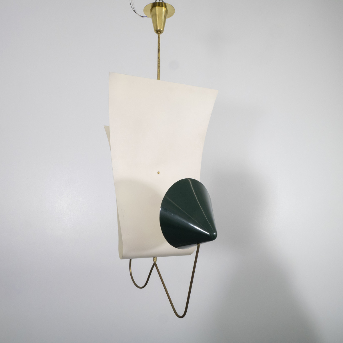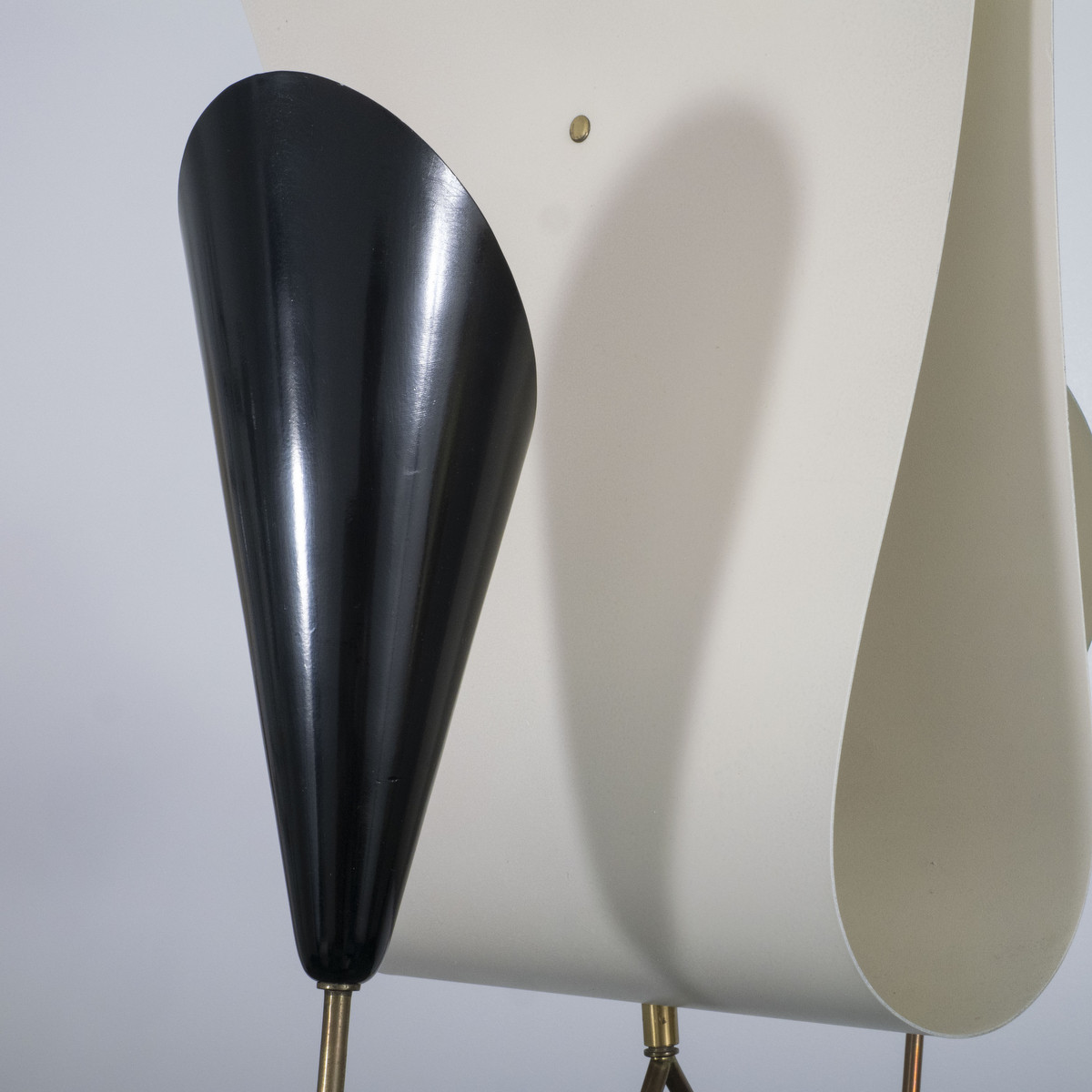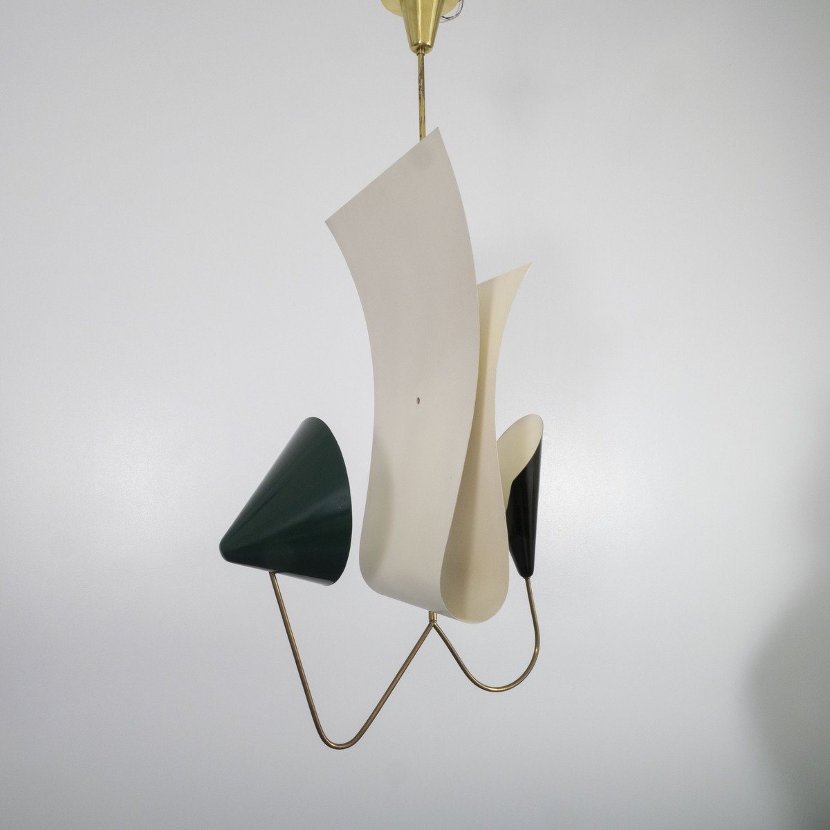 Sculptural chandelier with "wavy cloth" metal detail at center and bullet shades attributed to Gilardi and Barzaghi. UL certified. x1 E26 and x1 E12 socket.