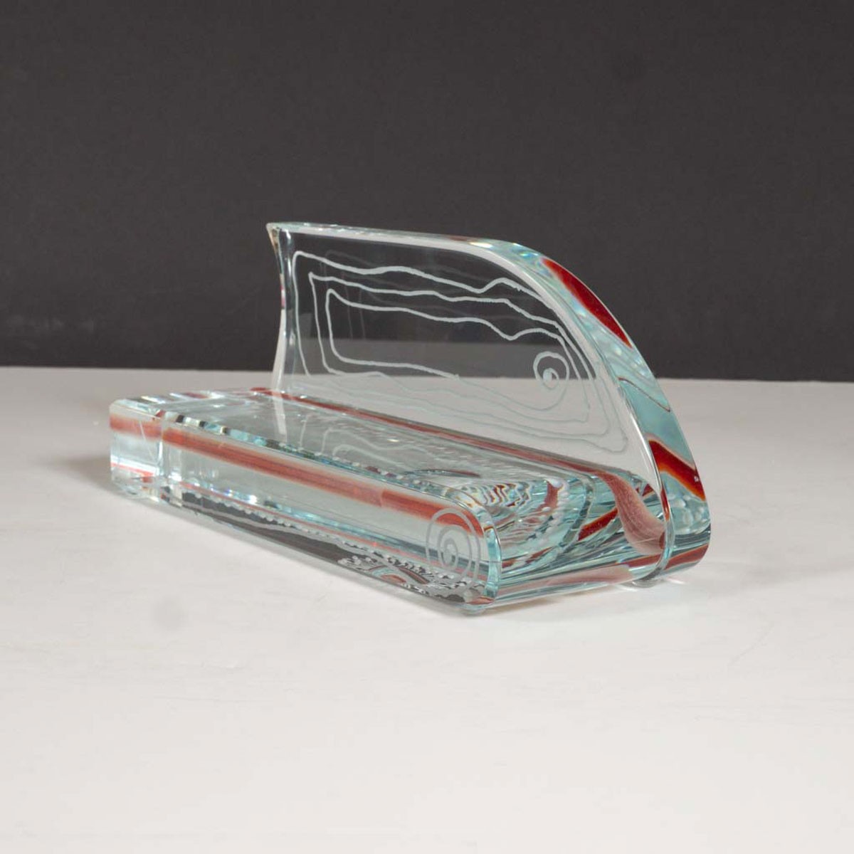 Art glass hand-carved, pen holder featuring etched linear motif and layered red glass stripe by Jiri Jelinek.