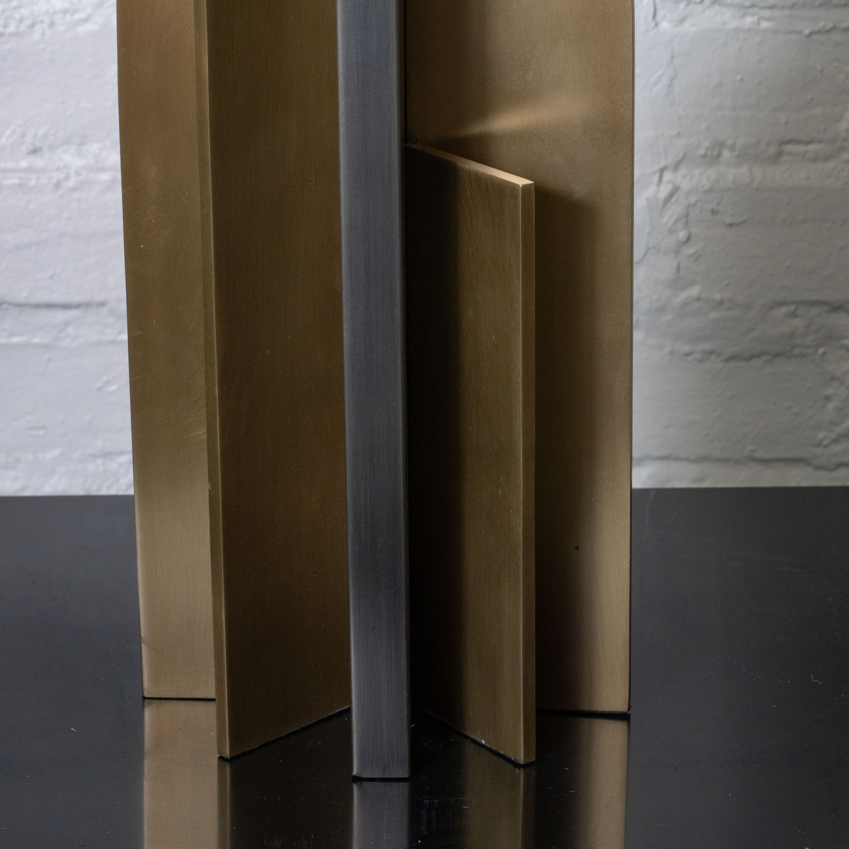Single Bauhaus inspired skyscraper table lamp composed of brushed brass and treated metal panels.