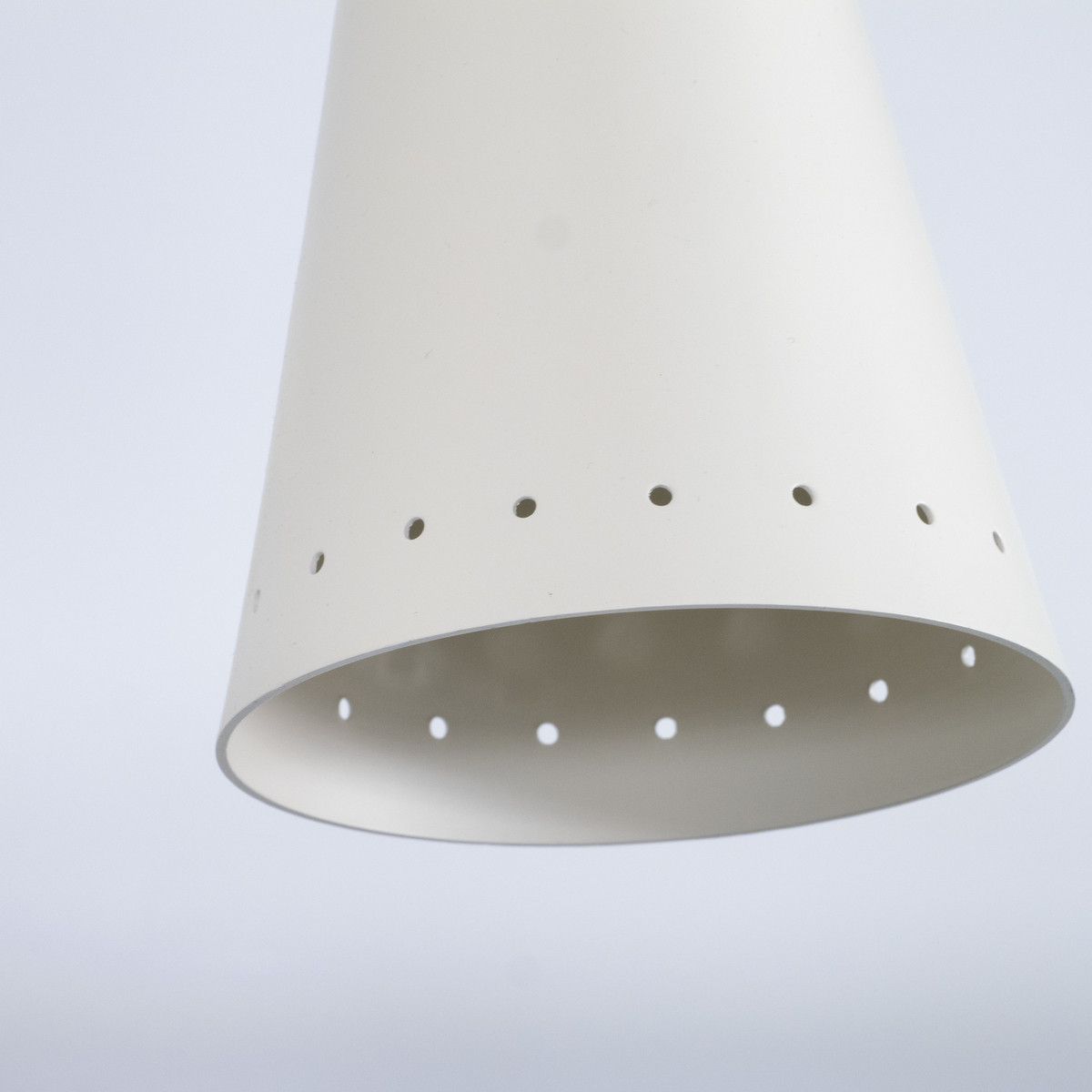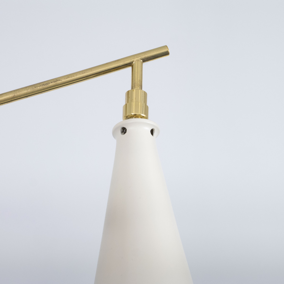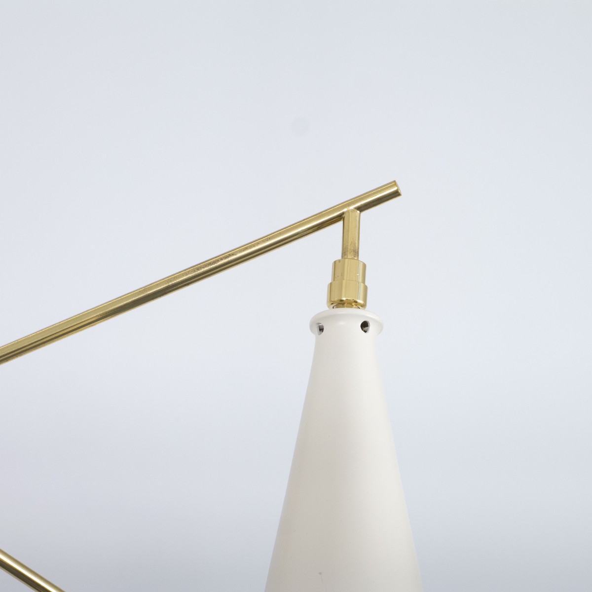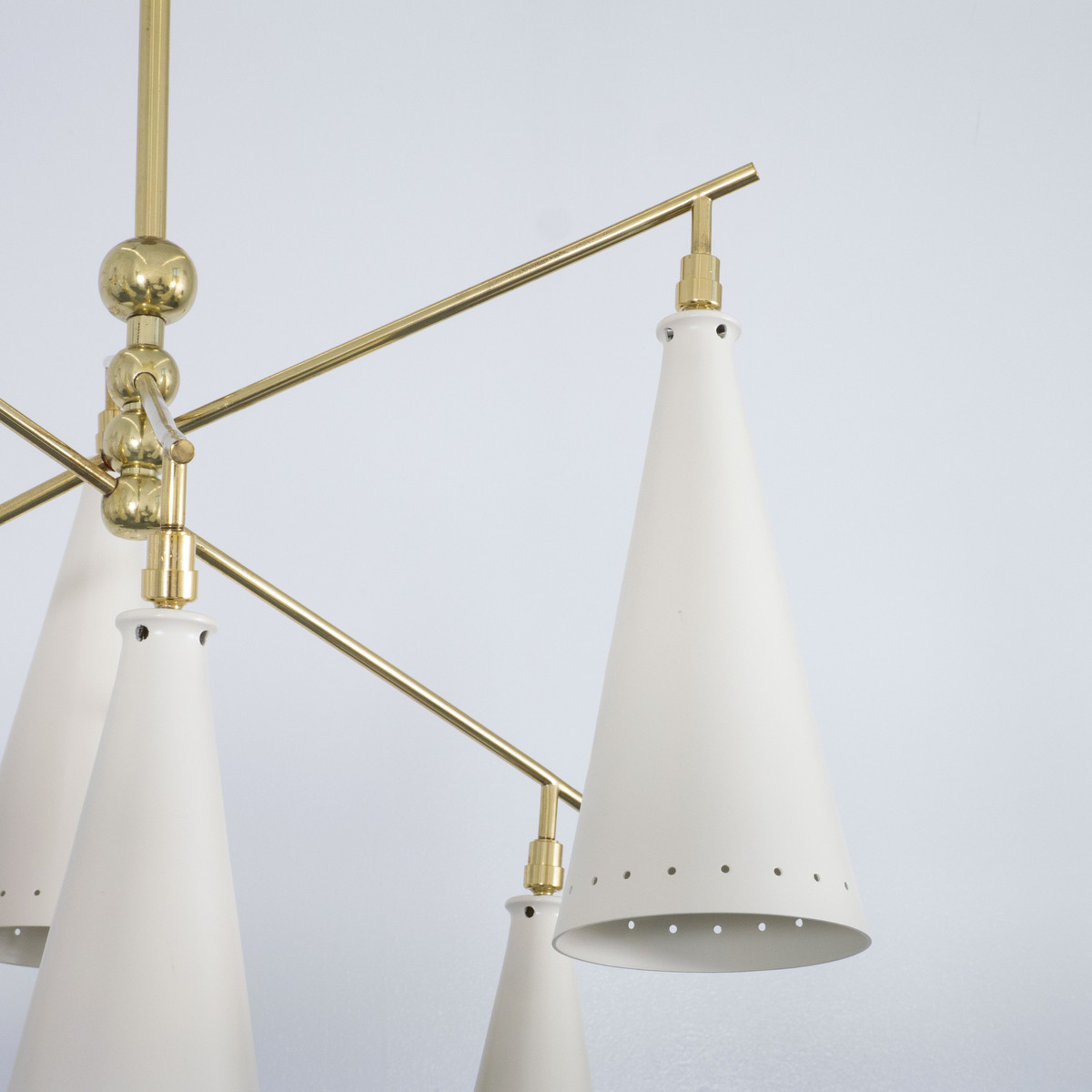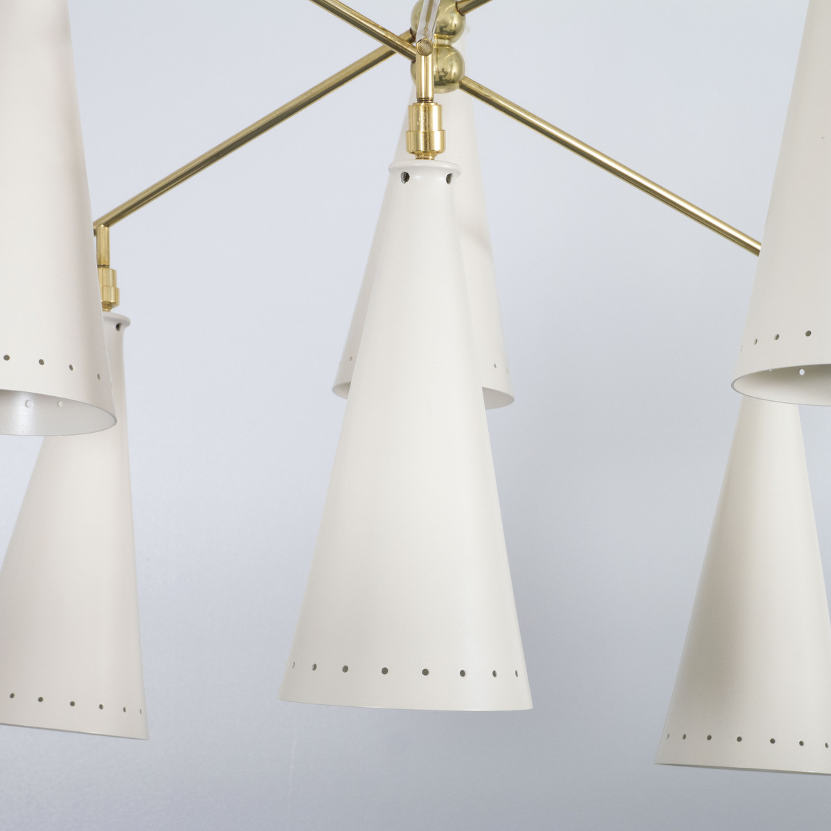Brass Stilnovo style chandelier with conical shades. UL certified.