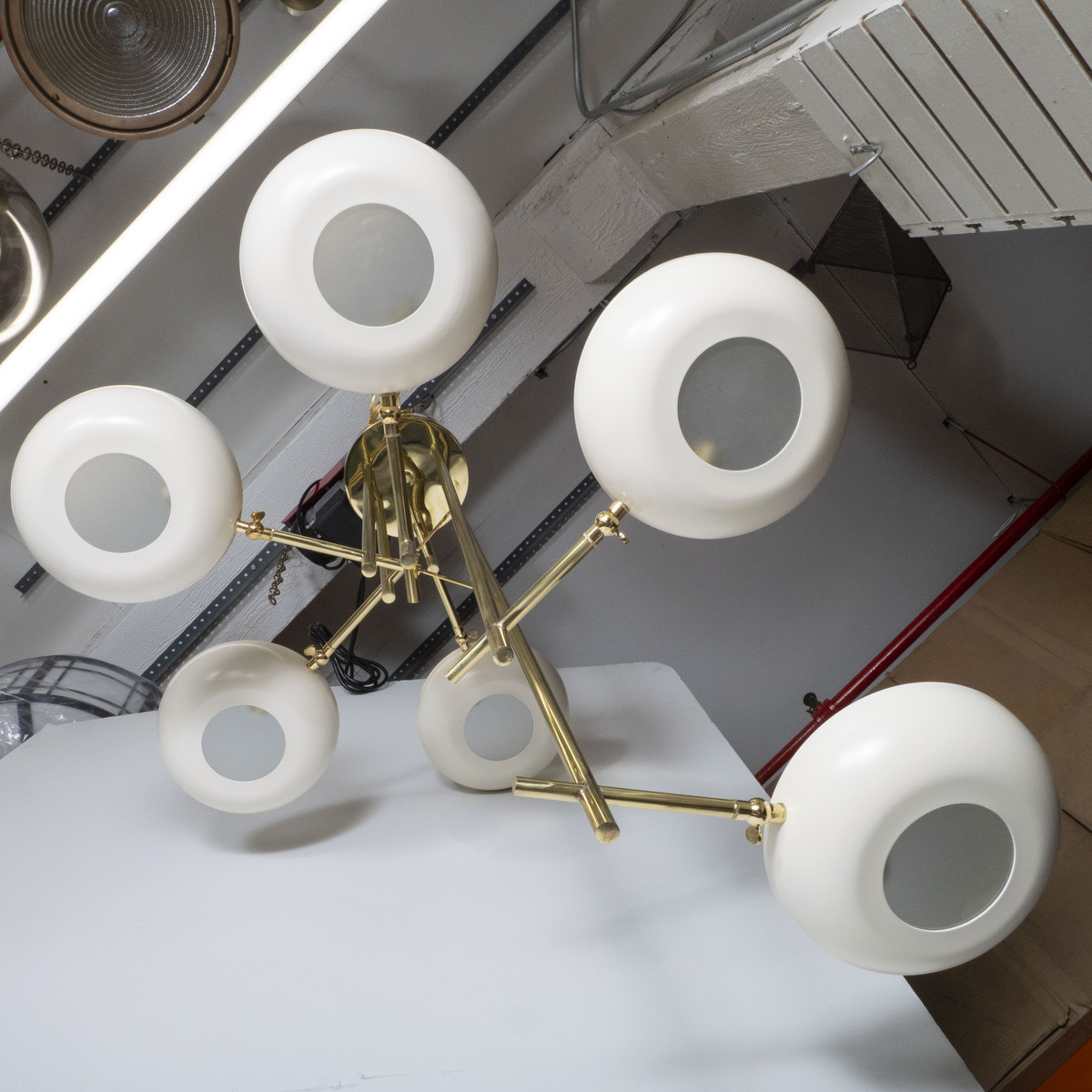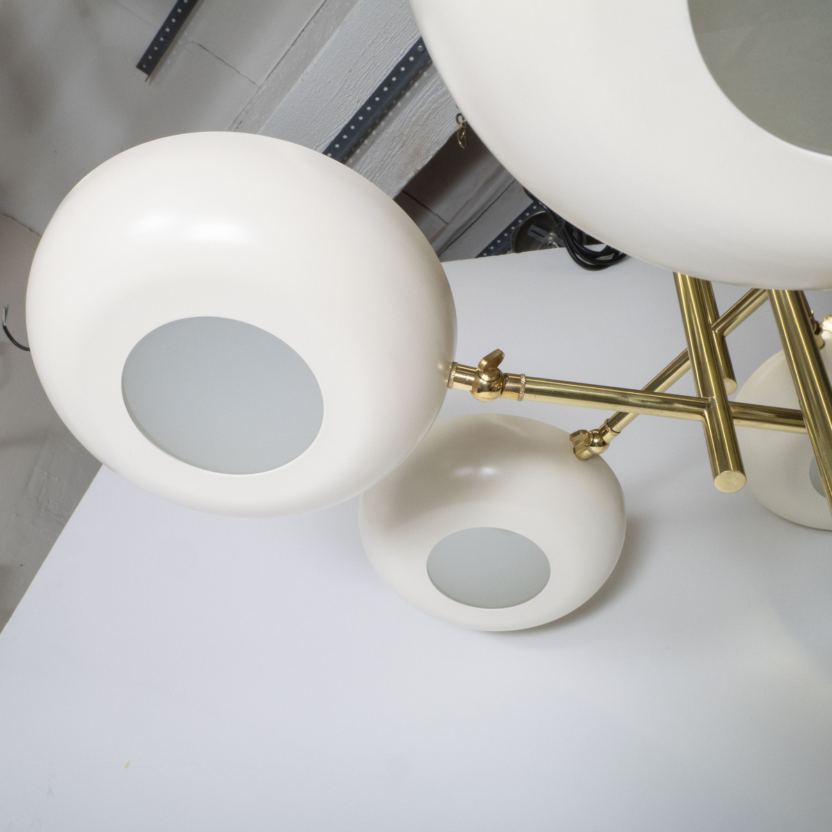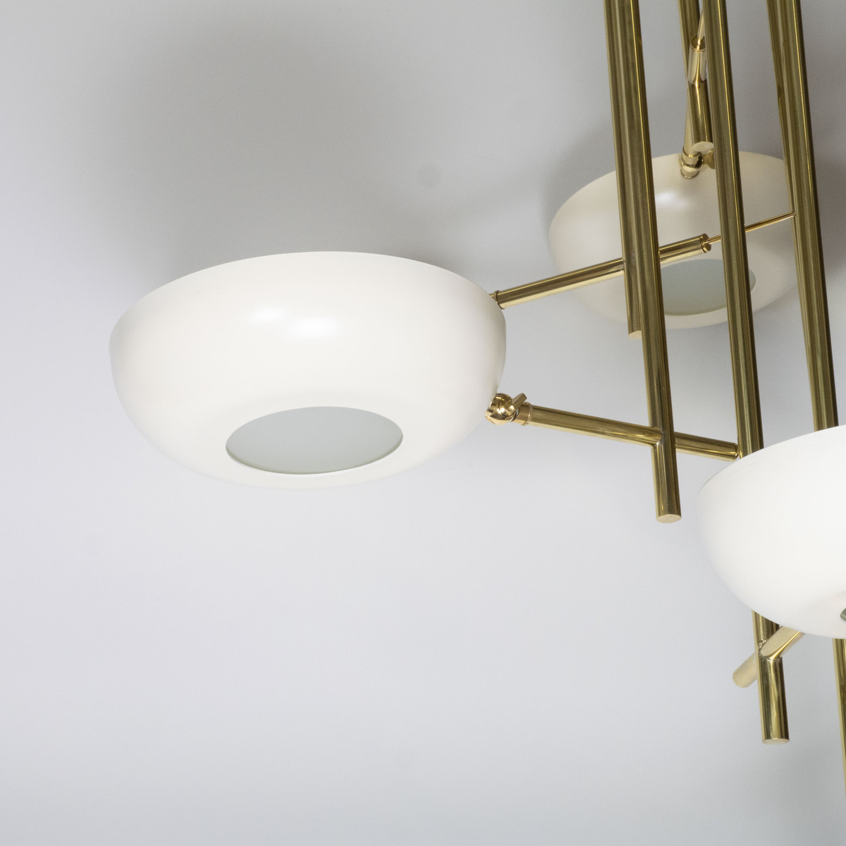 Stilnovo style stepped brass chandelier featuring enameled metal shades with frosted frosted diffusers.