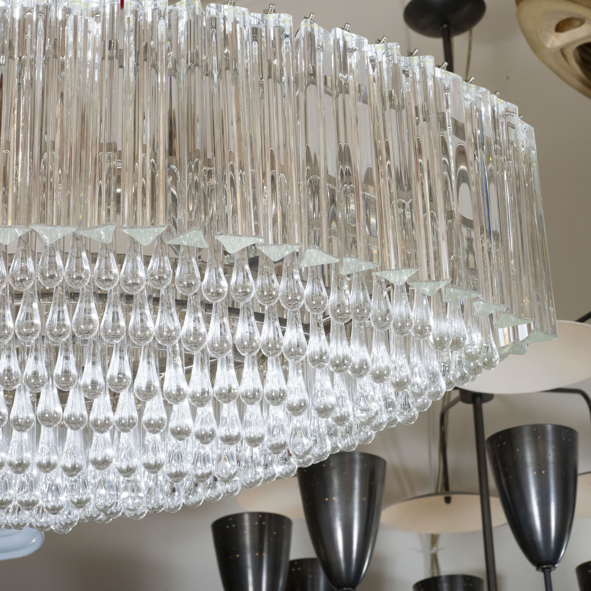Chandelier composed of multiple tiers/rows of triangular crystal prisms by Venini. UL certified.